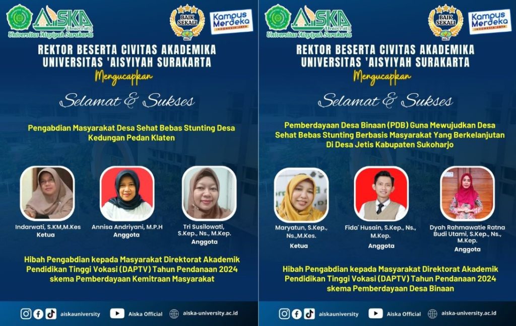 Dua proposal usulan Pengabdian kepada Masyarakat (PkM) dari dosen Universitas ‘Aisyiyah Surakarta (Aiska) sukses mendapat pendanaan Hibah PkM Tahun Anggaran 2024. Keputusan itu berdasarkan Surat Nomor 0520/D4/AL.04/2024 tertanggal 12 Maret 2024 dari Direktorat Akademik Pendidikan Tinggi Vokasi (APTV) Kementerian Pendidikan, Kebudayaan, Riset, dan Teknologi Republik Indonesia (Kemendikbudristek RI).