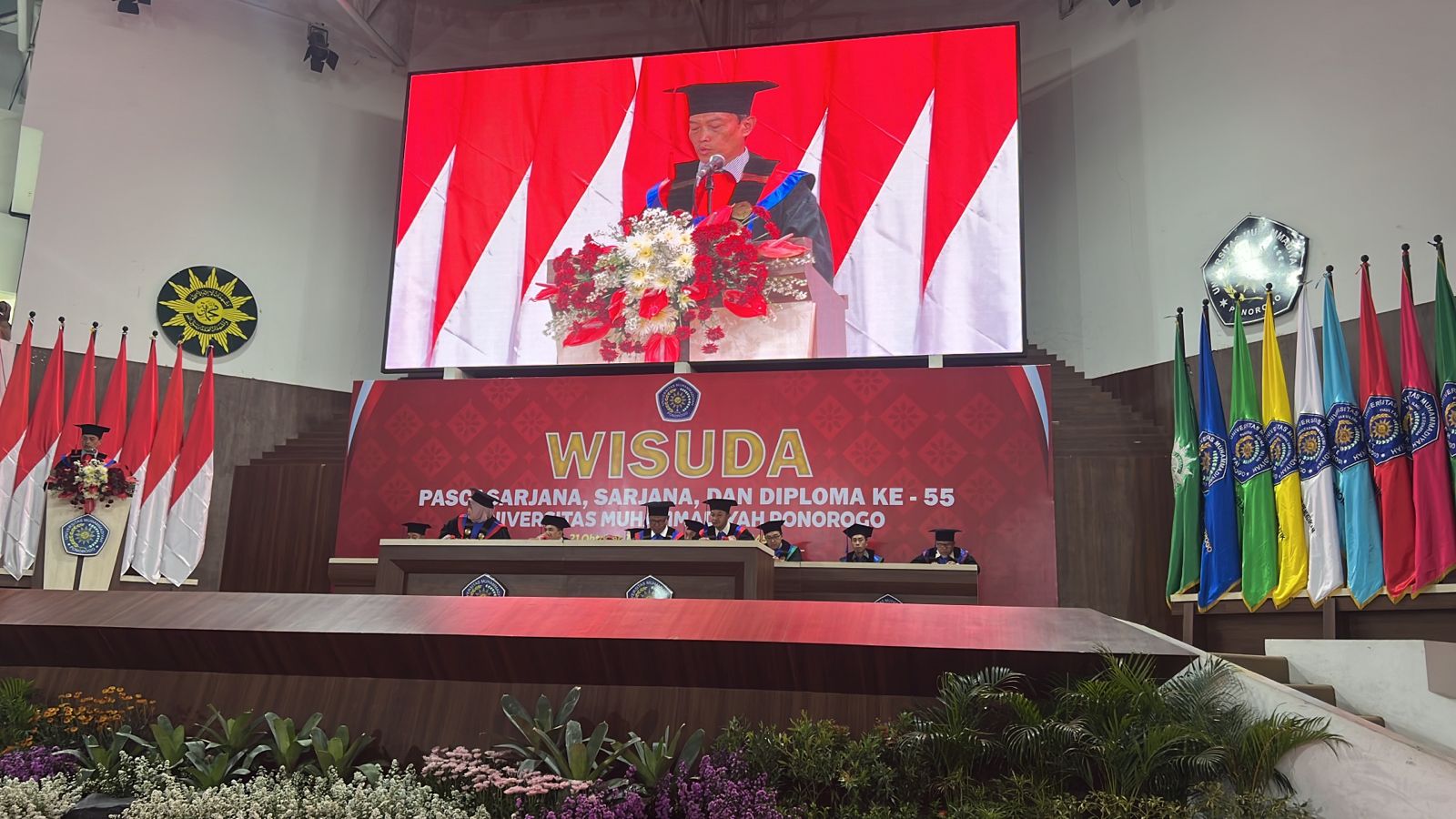 Universitas Muhammadiyah Ponorogo (UMPO) mengadakan Wisuda Pascasarjana, Sarjana, dan Diploma di kampus setempat, Sabtu (21/10/2023). Sebanyak 833 wisudawan yang terdiri dari 26 lulusan program pascasarjana, 677 lulusan program sarjana, 67 lulusan program diploma dan 63 lulusan program Ners resmi dinyatakan lulus. “Dengan demikian sampai dengan periode ini, UMPO telah mewisuda lulusannya sebanyak 19.165 orang,” papar Dr Happy Susanto, MA selaku Rektor UMPO. Turut hadir, Sekretaris Majelis Diktilitbang PPM, Ahmad Muttaqin, MA PhD, Bupati Ponorogo, Sugiri Sancoko, SE MM, Ketua DPRD Ponorogo, Sunarto, SPd, dan seluruh tamu undangan.