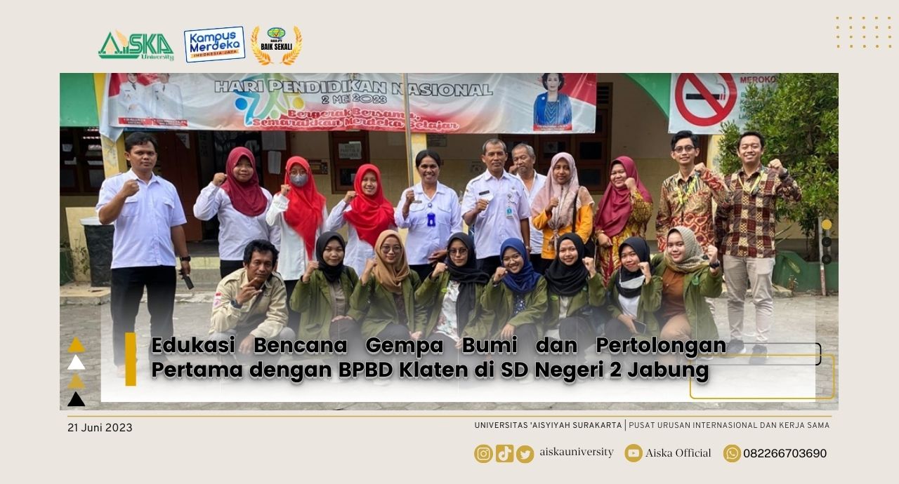 KLATEN – Program Studi (Prodi) Profesi Ners Universitas ‘Aisyiyah Surakarta (AISKA) berkerjasama dengan Badan Penanggulangan Bencana Daerah (BPBD) Klaten melaksanakan kegiatan simulasi “Siaga Bencana Gempa Bumi dan Edukasi Pertolongan Pertama” di SD Negeri 2 Jabung, Gantiwarno, Klaten, pada Rabu (21/6) lalu. Kegiatan ini diikuti oleh kurang lebih 50 siswa. Sebanyak tujuh orang mahasiswa Profesi Ners beserta dosen Fakultas Ilmu Kesehatan (FIK) AISKA menjadi pengarah dalam kegiatan ini yang didampingi oleh pihak dari BPBD Klaten.