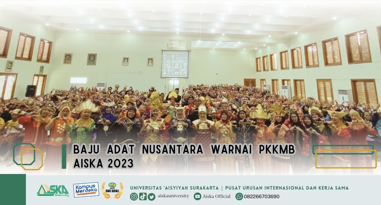 Universitas ‘Aisyiyah Surakarta (AISKA) menggelar kegiatan Pengenalan Kehidupan Kampus bagi Mahasiswa Baru (PKKMB) Tahun Akademik (TA) 2023/2024. Mengusung tema “Mewujudkan Generasi Unggul, Inovatif, Kompetitif dan Berbudaya Menuju Kampus Merdeka Belajar ”, kegiatan PKKMB ini dilaksanakan selama empat hari, Senin-kamis (18-16/09/2023). Ada 4 kata kunci yang dijadikan tema PKKMB tahun ini generasi unggul yang memiliki makna generasi yang memiliki kecerdasan dan karakter yang baik dan memberikan dampak bagi diri sendiri, sesama dan lingkungannya, inovatif memiliki makna kemampuan menciptakan ide-ide baru, kompetitif memiliki makna menjadi mahasiswa yang memiliki nilai tambah, kelebihan dan keunggulan dibanding mahasiswa lain serta berbudaya seseorang yang menguasai dan berperilaku sesuai dengan nilai-nilai budaya. Corak berbudaya salah satu yang nampak dalam kegiatan PKKMB adalah beragam baju adat yang dipakai. Beraneka ragam baju adat dari nusantara mewarnai gelaran PKKMB AISKA tahun 2023. Tak hanya mahasiswa baru, namun segenap jajaran pimpinan dan panitia penyelenggara pun ikut meramaikan PKKMB dengan mengenakan baju adat di Indonesia.