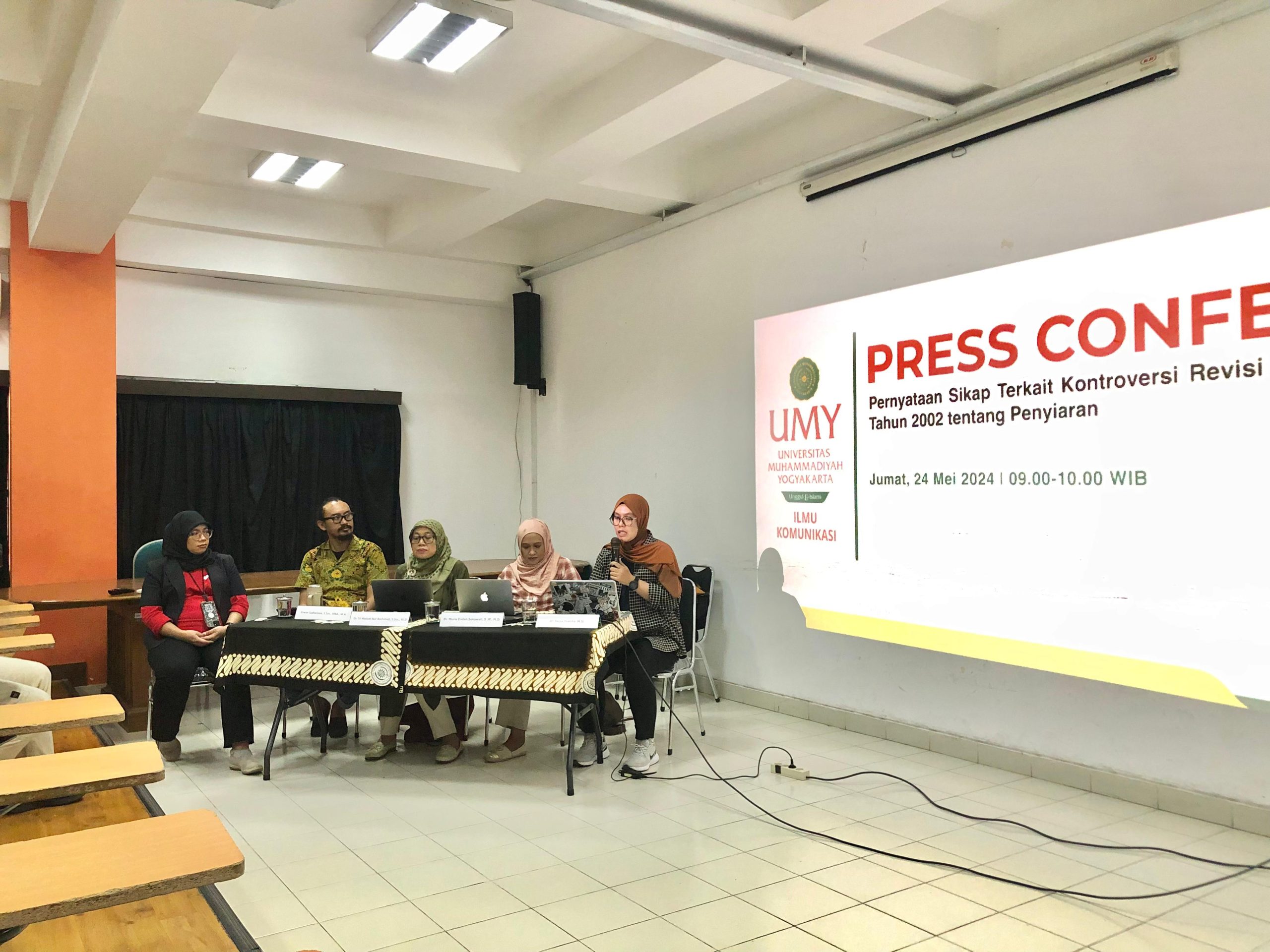 Sivitas akademika Ilmu Komunikasi Universitas Muhammadiyah Yogyakarta (UMY) menyelenggarakan Press Conference “Pernyataan Sikap Terkait Kontroversi Revisi Undang-Undang No. 32 Tahun 2002 tentang Penyiaran” pada Jum’at (24/04/2024). Agenda ini dilaksanakan sebagai bentuk menyikapi dan menentang tegas atas revisi UU penyiaran yang saat ini tengah dibahas di Dewan Perwakilan Rakyat (DPR) Republik Indonesia.