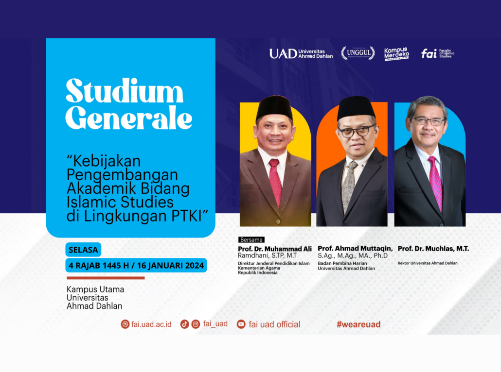 Fakultas Agama Islam (FAI) Universitas Ahmad Dahlan (UAD) menyelenggarakan Studium Generale bertajuk “Kebijakan Pengembangan Akademik Bidang Islamic Studies di Lingkungan PTKI”. Kegiatan tersebut dilaksanakan di Amphiteater Fakultas Kedokteran UAD pada Selasa (16/1/2024).