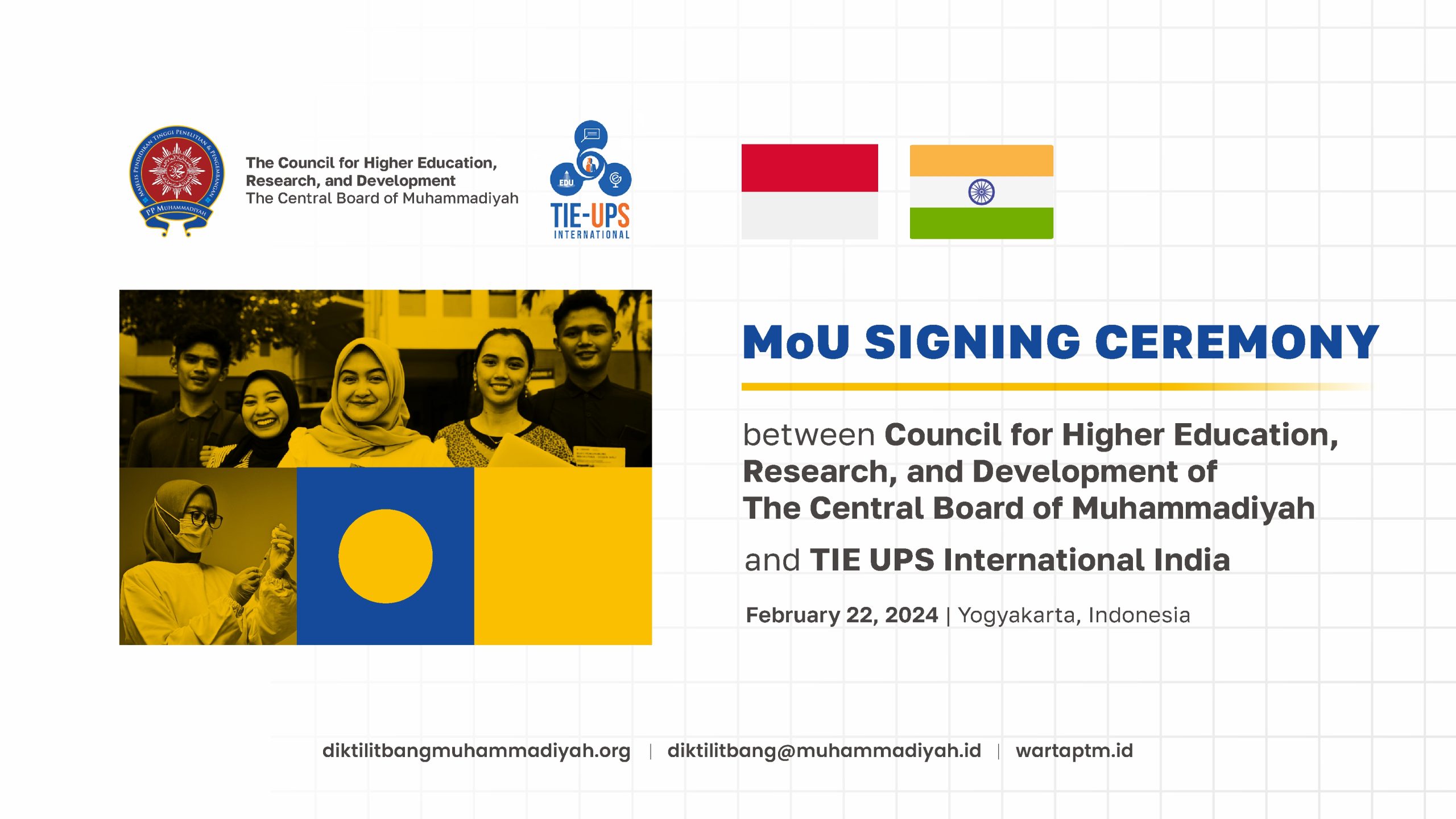 Majelis Diktilitbang PPM melakukan penandatanganan MoU bersama TIE UPS International India dalam rangka kerja sama antara India dan Indonesia pada sektor pendidikan. Penandatanganan MoU dilakukan secara daring berlokasi di dua negara berbeda yakni Indonesia dan India, Kamis (22/02/2024).