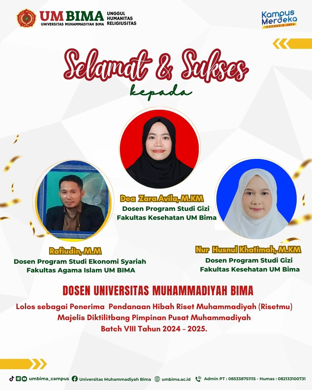 Dosen Universitas Muhammadiyah Bima dari Program Studi Gizi Fakultas Kesehatan dan Program Studi Ekonomi Syariah Fakultas Agama Islam Universitas Muhammadiyah Bima berhasil meraih hibah penelitian Risetmu Batch VIII tahun 2024-2025 dari Majelis Diktilitbang PP Muhammadiyah.