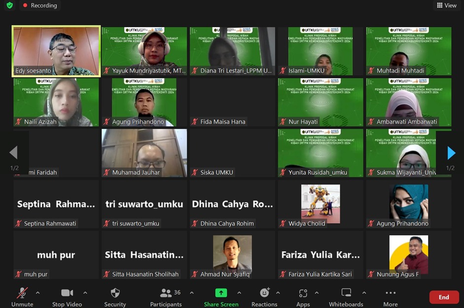 Lembaga Penelitian dan Pengabdian Masyarakat Universitas Muhammadiyah Kudus (LPPM UMKU) meneguhkan komitmennya dalam mendukung kegiatan riset dan Pengabdian kepada Masyarakat (PkM). Komitmen tersebut tercermin dengan suksesnya agenda “Klinik Proposal Hibah Penelitian dan Pengabdian kepada Masyarakat” yang digelar secara daring pada Kamis, (28/03/24) dan diikuti oleh para dosen dari berbagai disiplin ilmu di UMKU.