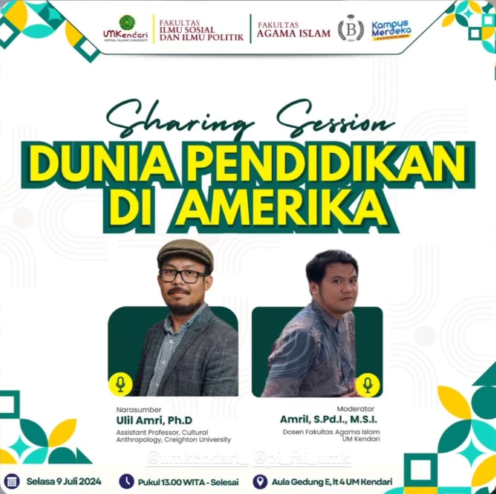 Fakultas Agama Islam (FAI) Universitas Muhammadiyah (UM) Kendari menyelenggarakan Sharing Session yang bertajuk “Dunia Pendidikan di Amerika” pada Selasa (09/07/2024) bertempat di Aula Gedung E, lt 4 UM Kendari. Acara ini menghadirkan narasumber yang kompeten di bidang pendidikan Amerika, yaitu Mr Ulil Amri, PhD, seorang dosen Cultural Anthropology dari Creighton University, California.