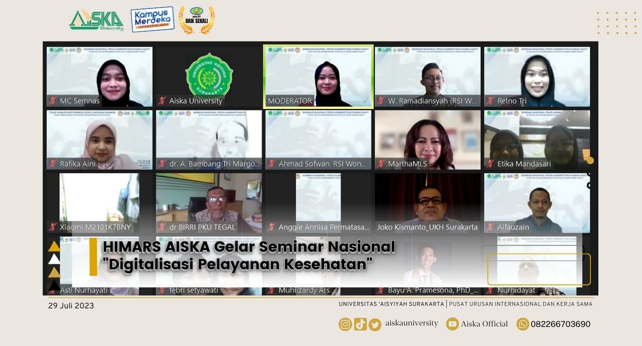 Himpunan Mahasiswa Administrasi Rumah Sakit (HIMARS) Universitas ‘Aisyiyah Surakarta (AISKA) melangsungkan kegiatan seminar nasional dengan tema “Digitalisasi Pelayanan Kesehatan” yang diadakan pada Sabtu (29/7/2023) lalu. Seminar nasional ini diadakan melalui zoom meeting dan disiarkan langsung di akun resmi YouTube Universitas ‘Aisyiyah Surakarta, AISKA Official. Kegiatan ini diadakan dengan tujuan untuk menambah wawasan mengenai digitalisasi pelayanan kesehatan di era transformasi 5.0.