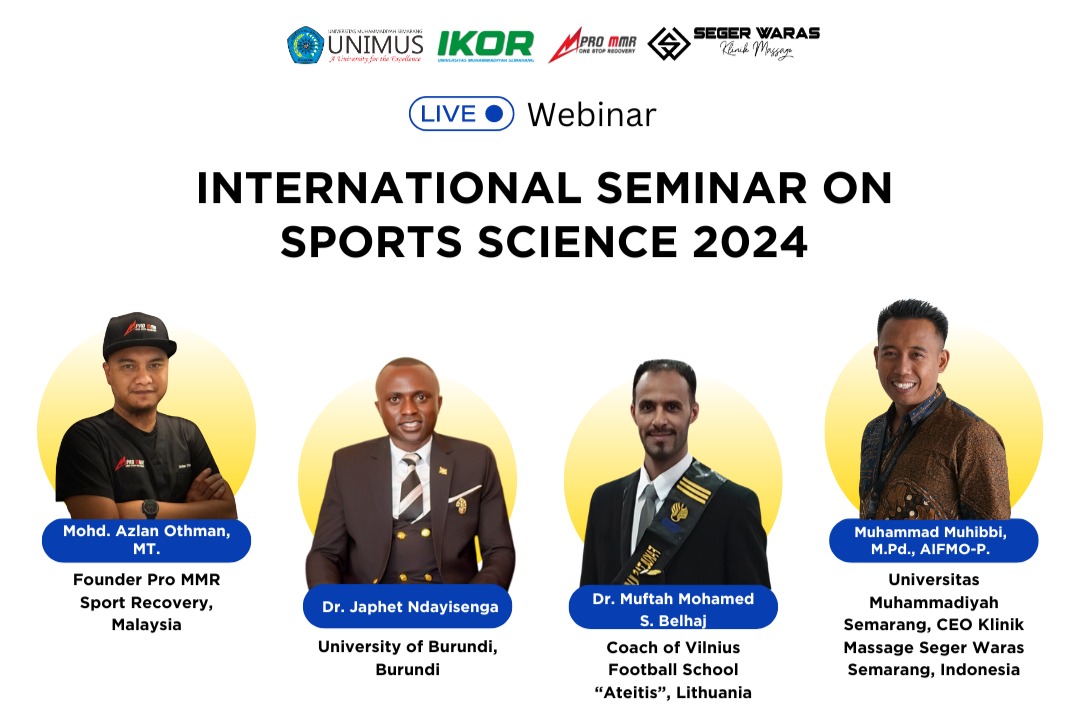 Program Studi Ilmu Keolahragaan S-1 Fakultas Kesehatan Masyarakat (FKM) Universitas Muhammadiyah Semarang (UNIMUS) menyelenggarakan International Seminar on Sports Science 2024 dengan tema “Sports Massage for Athlete Performance Enhancement, Injury Prevention, and Sports Entrepreneurship Opportunities”. Kegiatan ini dilaksanakan pada Selasa (25/6) secara hybrid, dengan peserta luring di Ruang 406 Gedung Labkes UNIMUS Lantai 4 dan peserta daring yang berasal dari berbagai latar belakang seperti guru, mahasiswa, dosen, dan praktisi massage olahraga dari dalam dan luar negeri sebanyak 302 peserta.