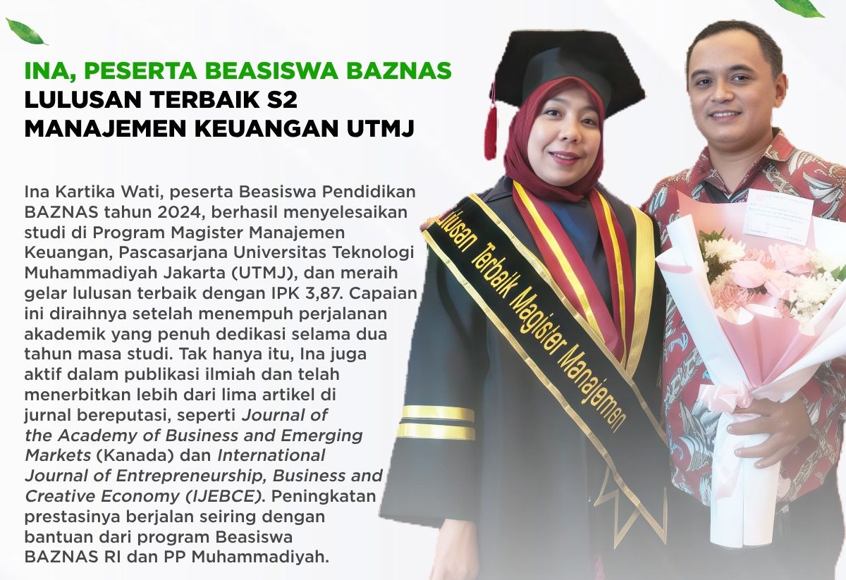 Ina Kartika Wati, peserta Beasiswa Pendidikan BAZNAS tahun 2024, berhasil menyelesaikan studi di Program Magister Manajemen Keuangan, Pascasarjana Universitas Teknologi Muhammadiyah Jakarta (UTMJ), dan meraih gelar lulusan terbaik dengan IPK 3,87. Capaian ini diraihnya setelah menempuh perjalanan akademik yang penuh dedikasi selama dua tahun masa studi.