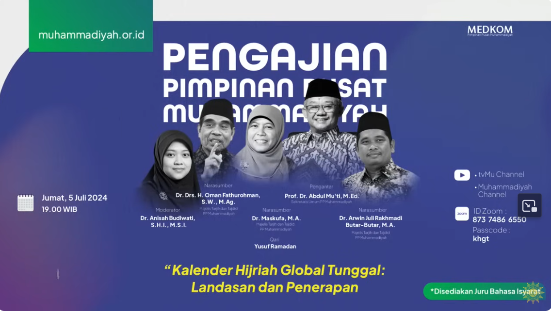 Dalam rangka menyambut Tahun Baru 1446 Hijriah, Pimpinan Pusat Muhammadiyah menggelar pengajian dengan judul “Kalender Hijriah Global Tunggal: Landasan dan Penerapan”. Pengajian ini disiarkan secara langsung melalui tvMu pada Jumat (5/7/2024). Acara ini sekaligus menandai launching Kalender Hijriah Global Tunggal (KHGT) mulai tahun 1446 Hijriah.