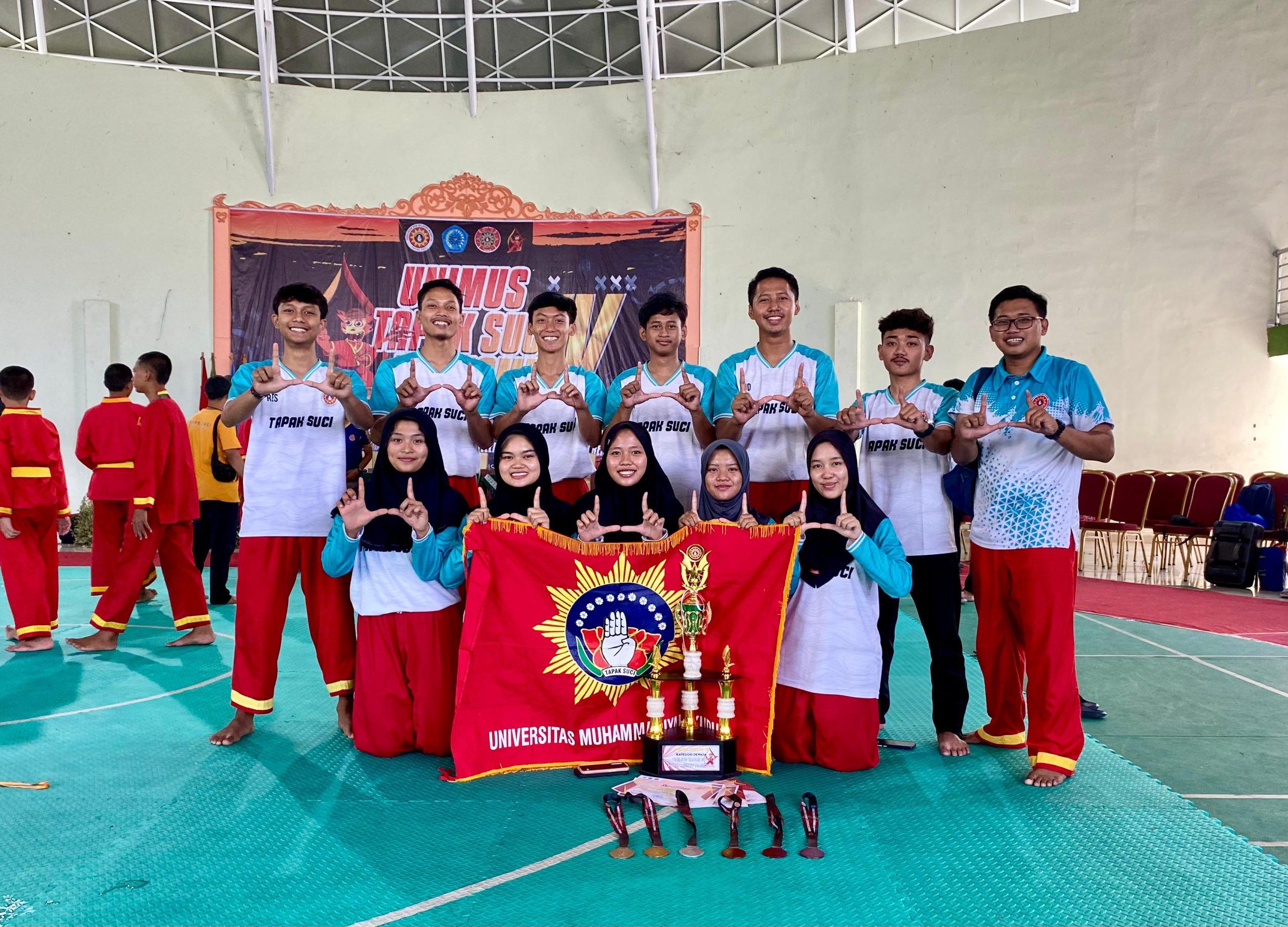 Tim Tapak Suci Universitas Muhammadiyah Kudus (UMKU) meraih juara umum ketiga untuk kategori dewasa dalam even Unimus Tapak Suci Turnamen IV Nasional bertempat di Gedung Serbaguna UNIMUS Semarang, Sabtu (24/08/2024). Total perolehan medali sebanyak 2 emas, 1 perak, dan 3 perunggu. “Alhamdulillah kita berhasil meraih juara umum ketiga, hampir saja kami menyapu bersih kategori dewasa, semoga di event berikutnya bisa meraih hasil maksimal” ujar Dias Sawaludin peraih emas kategori kelas F Putera.