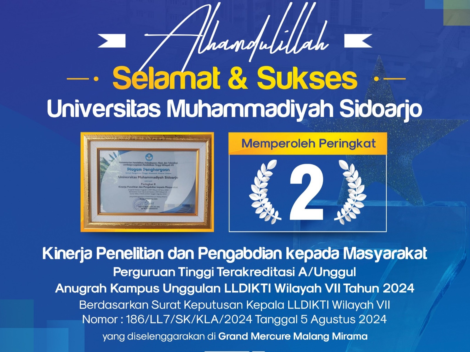 Universitas Muhammadiyah Sidoarjo (Umsida) meraih peringkat dua Kinerja Penelitian dan Pengabdian Masyarakat Perguruan Tinggi Terakreditasi A/Unggul Anugerah Kampus Unggulan LLDIKTI Wilayah VII pada Kamis, (05/09/2024) di Grand Mercure Malang Mirama.
