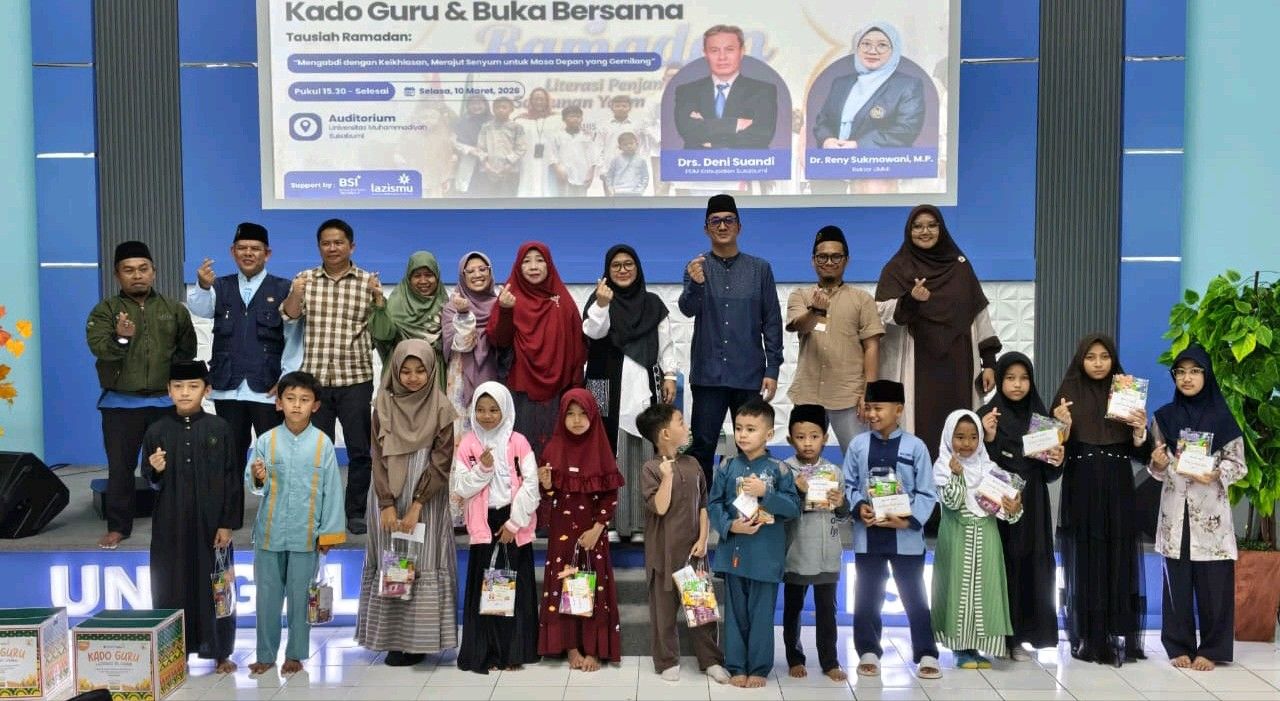 Universitas Muhammadiyah Sukabumi (UMMI) melalui Lazismu Kantor Layanan (KL) UMMI menyalurkan program Kado Guru dan Santunan Anak Yatim dalam rangka menyemarakkan Ramadan 1447 H. Kegiatan ini berlangsung di Auditorium UMMI pada Selasa (10/3/2026).