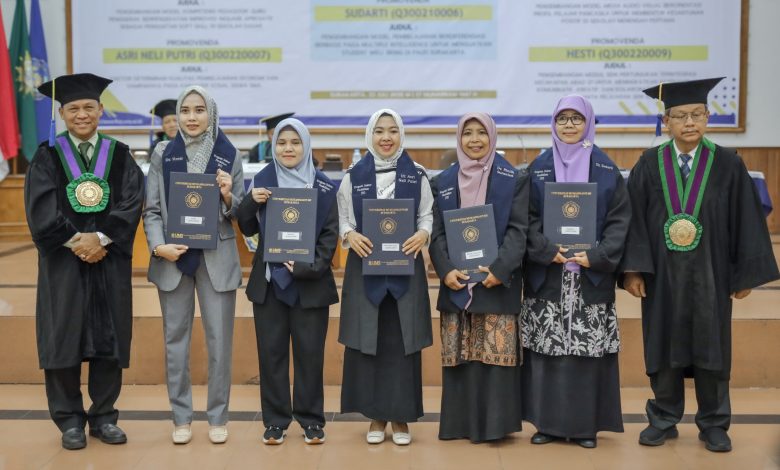 Lima perempuan lulusan Program Doktor Pendidikan FKIP Universitas Muhammadiyah Surakarta (UMS) resmi dikukuhkan dalam sidang promosi di Auditorium Moh Djazman, Selasa (22/7). Kelima doktor baru yang dijuluki “Srikandi Pendidikan” menghadirkan terobosan penelitian yang menjawab permasalahan pendidikan Indonesia dari jenjang PAUD hingga SMA.