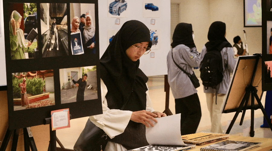 Ratusan karya mahasiswa Program Studi (Prodi) S1 Desain Komunikasi Visual (DKV) Universitas Muhammadiyah (UM) Surabaya menghiasi Gedung At Tauhid Tower lantai 13 dalam pameran perdana. Pameran bertajuk “Diskavika Vol.1: Expression In Color And Form” itu menjadi ajang kreativitas mahasiswa dalam mengekspresikan karya seni visual dari empat mata kuliah utama, yaitu fotografi, gambar bentuk, semiotika dasar, dan nirmana. Senin, (5-8-2024).