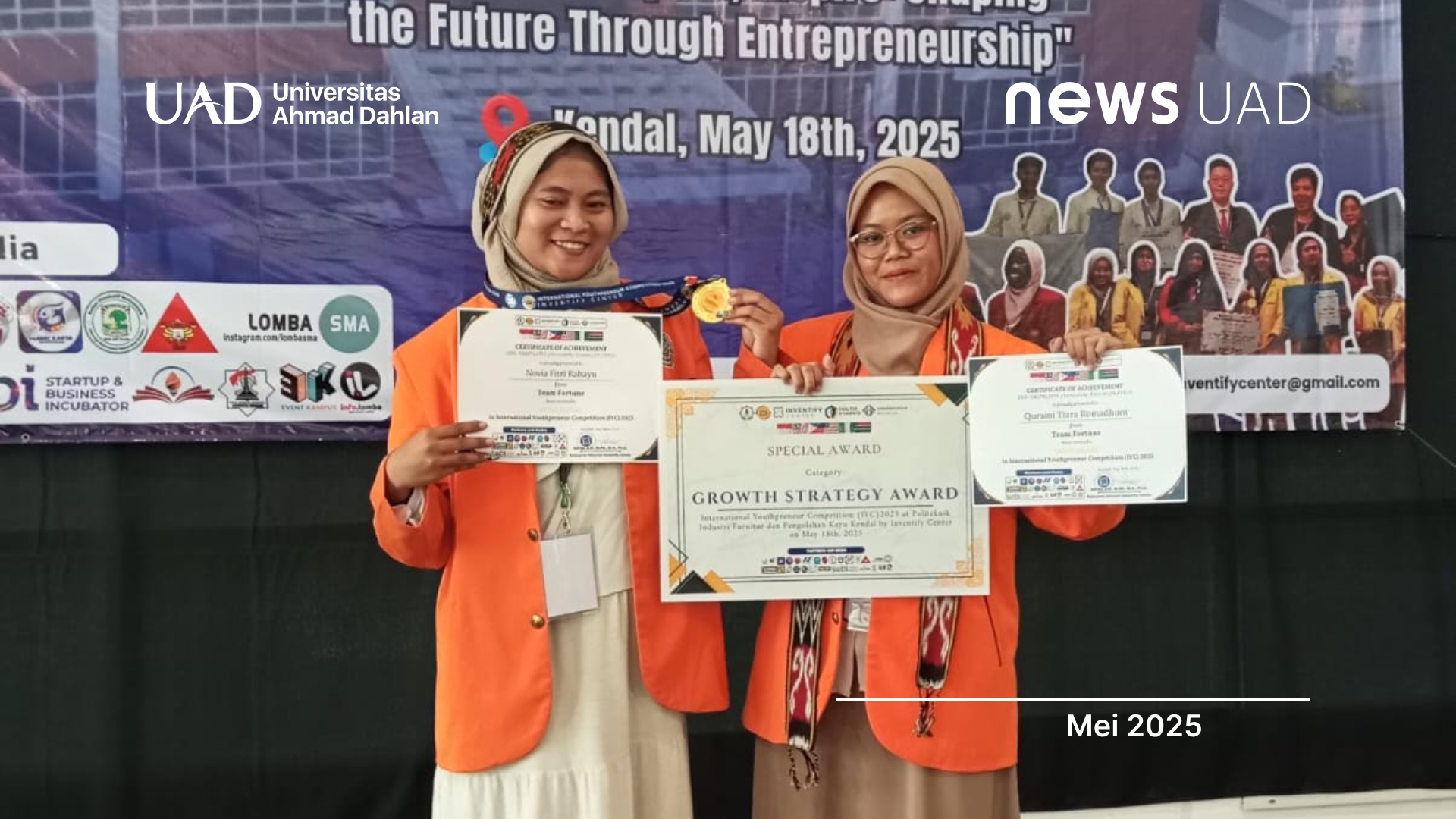 Dua mahasiswi Program Studi (Prodi) Perbankan Syariah (PBS) Fakultas Agama Islam (FAI) Universitas Ahmad Dahlan (UAD) kembali mengharumkan nama kampus dalam ajang internasional. Quraini Tiara Romadhoni dan Novia Fitri Rahayu, yang tergabung dalam Tim Fortune, berhasil meraih Gold Medal serta Special Award: Growth Strategy Award pada ajang International Youthpreneur Competition (IYC) 2025.