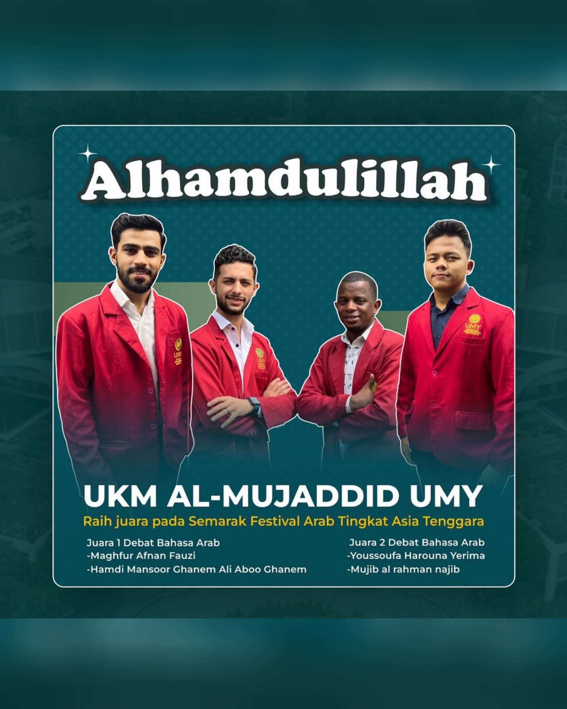 Empat Mahasiswa Universitas Muhammadiyah Yogyakarta (UMY) kembali menorehkan prestasi dalam ajang kompetisi Bahasa Arab tingkat Nasional. Mereka adalah Hamdi Mansoor mahasiswa Hubungan Internasional, Maghfur Afnan Fauzi mahasiswa Pendidikan Bahasa Arab, Mujib Alrahman Najib mahasiswa Teknik Elektro dan Youssoufa Harouna mahasiswa Pendidikan Bahasa Arab berhasil meraih juara 1 dan juara 2 pada kegiatan Semarak Festival Arab (SAFAR) ke-13 dalam lomba debat bahasa Arab yang diselenggarakan oleh BEMP Pendidikan Bahasa Arab Universitas Negeri Jakarta. Perlombaan ini dilaksanakan pada (2-5/11/2023) secara hybrid.