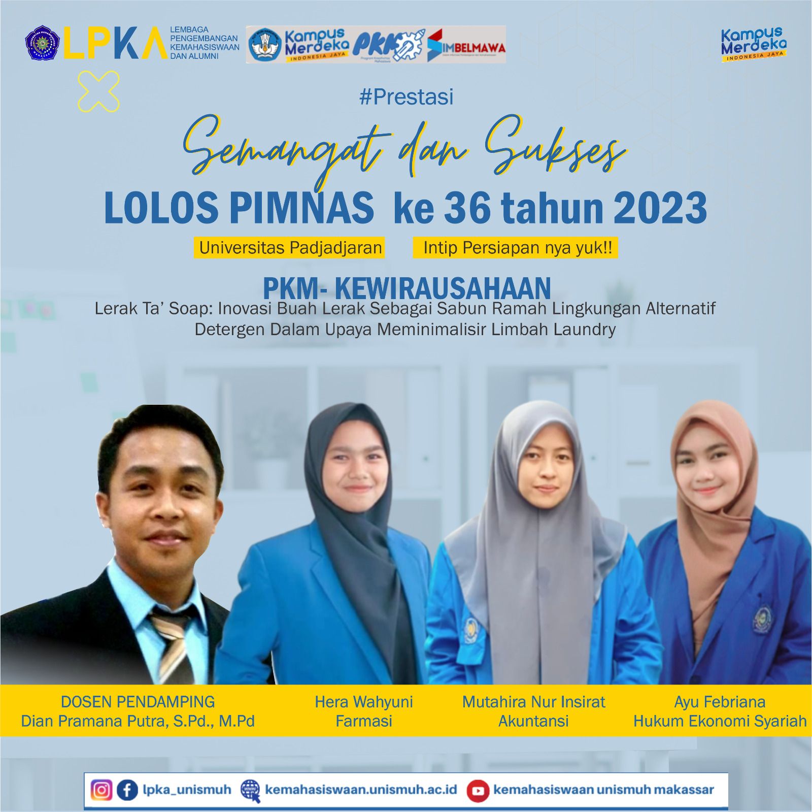 Tim PKM Kewirausahaan Unismuh yang terdiri dari Mutahirah Nur Insirat (Prodi Akuntansi), Hera Wahyuni (Prodi Farmasi), dan Ayu Febrina (Prodi Hukum Ekonomi Syariah) berhasil bersaing dengan ratusan tim dari berbagai perguruan tinggi. Inovasi mereka berfokus pada LERAK TA’ SOAP, sebuah sabun ramah lingkungan yang menggunakan buah lerak sebagai alternatif detergen dalam laundry.