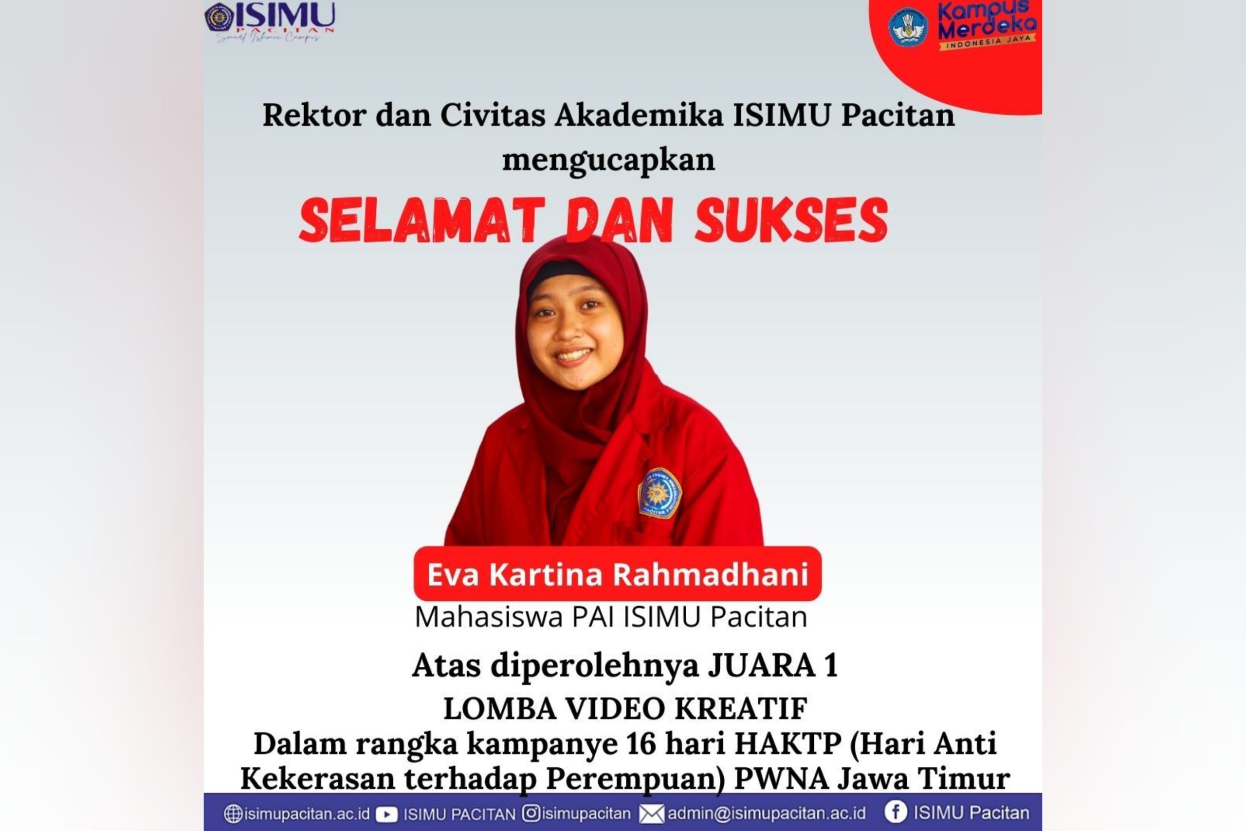 Mahasiswi Institut Studi Islam Muhammadiyah (ISIMU) Pacitan atas nama Eva Kartina Rahmadhani berhasil meraih Juara 1 Video Kreatif yang diselenggarakan oleh Pimpinan Wilayah Nasyiatul ‘Aisyiyah (PWNA) Jawa Timur.