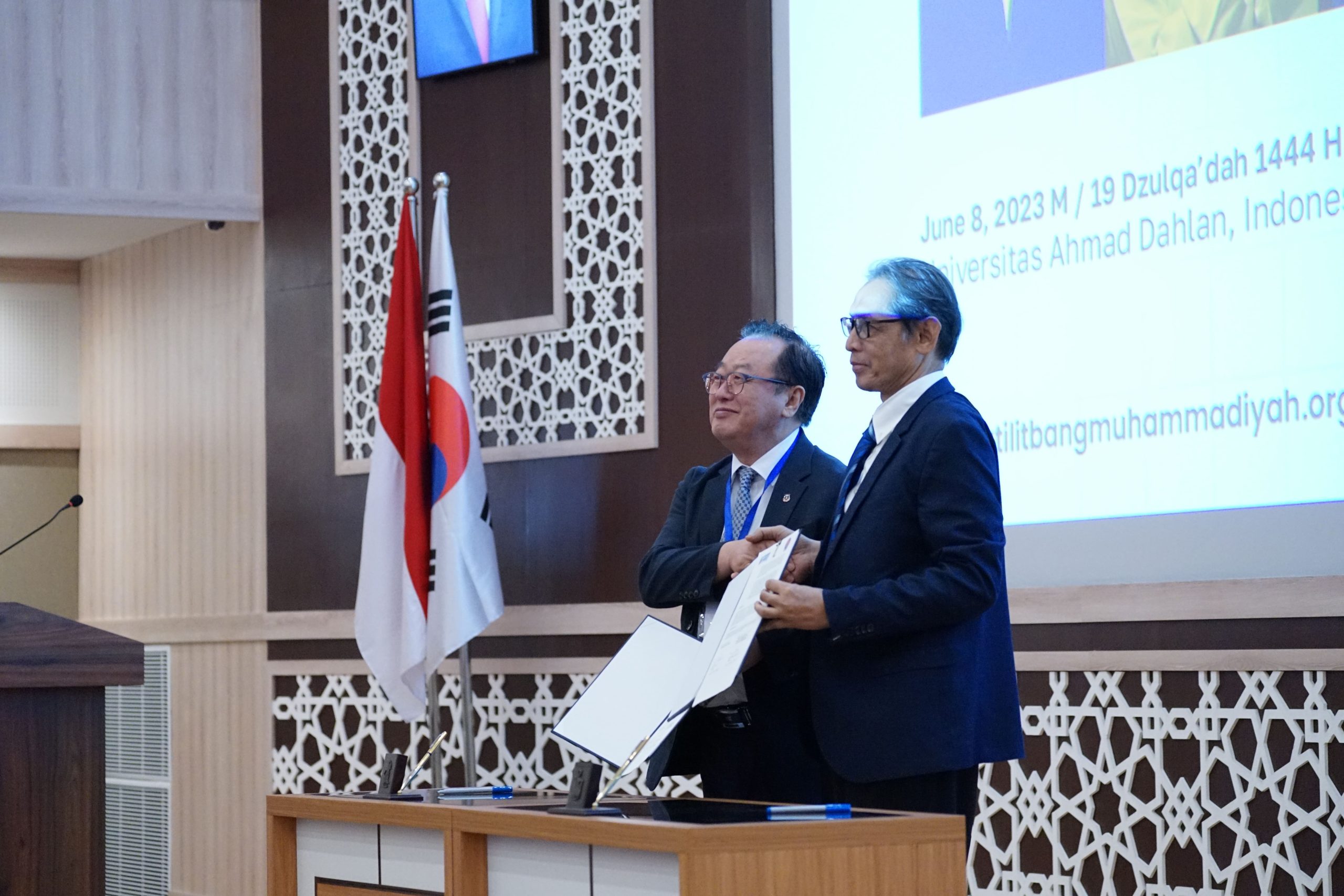 Majelis Diktilitbang PP Muhammadiyah kembali menjalin kerja sama internasional ditandai dengan penandatanganan kerja sama dengan Kyundong University (KDU) Korea Selatan dalam acara International Academic Partnership Symposium 2023 between Council for Higher Education, Research, and Development of The Central Board of Muhammadiyah and Kyungdong University Global “KDU Global-Ahmad Dahlan Scholarship”. Penandatangan MoU dilakukan oleh Prof Bambang Setiaji selaku Ketua Majelis Diktilitbang PPM dengan Prof John K Lee selaku Rektor Kyungdong University (KDU) Global bertempat di Amphitarium Kampus 4 Universitas Ahmad Dahlan, Kamis (8/6/2023). Penandatanganan MoA juga turut dilakukan oleh 49 Perguruan Tinggi Muhammadiyah ‘Aisyiyah (PTMA).