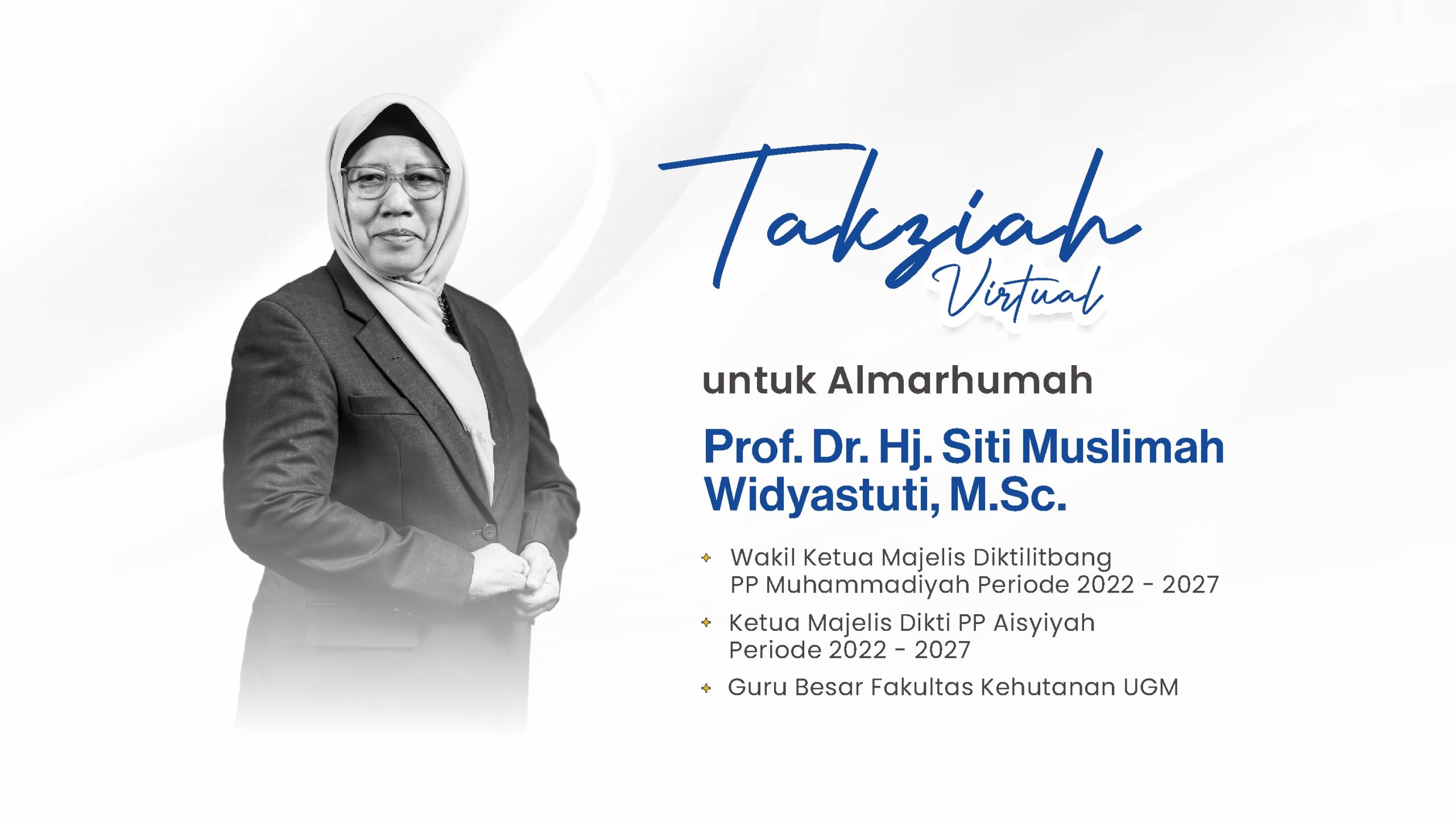 Innalillahi wa innailahi roojiuun, innalillahi wa innailaihi roojiuun. Kita semua akan kembali kepada Allah Swt pada akhirnya. Hari ini kita mendapat kabar duka atas Prof Dr Hj Siti Muslimah Widyastuti MSc,” demikian diawali oleh Muh Samsudin selaku pembawa acara Takziah Virtual untuk Almarhumah Prof Dr Hj Siti Muslimah Widyastuti MSc pada Rabu (9/8). Sebelumnya, Samsudin memberikan pengantar mengenai prosesi pemakaman almarhumah sore tadi, dengan menyampaikan bahwa almarhumah telah diberangkatkan dari PP Muhammadiyah ke makam husnul khotimah bersama seluruh keluarga besar Muhammadiyah, UGM, dan berbagai pihak lainnya.