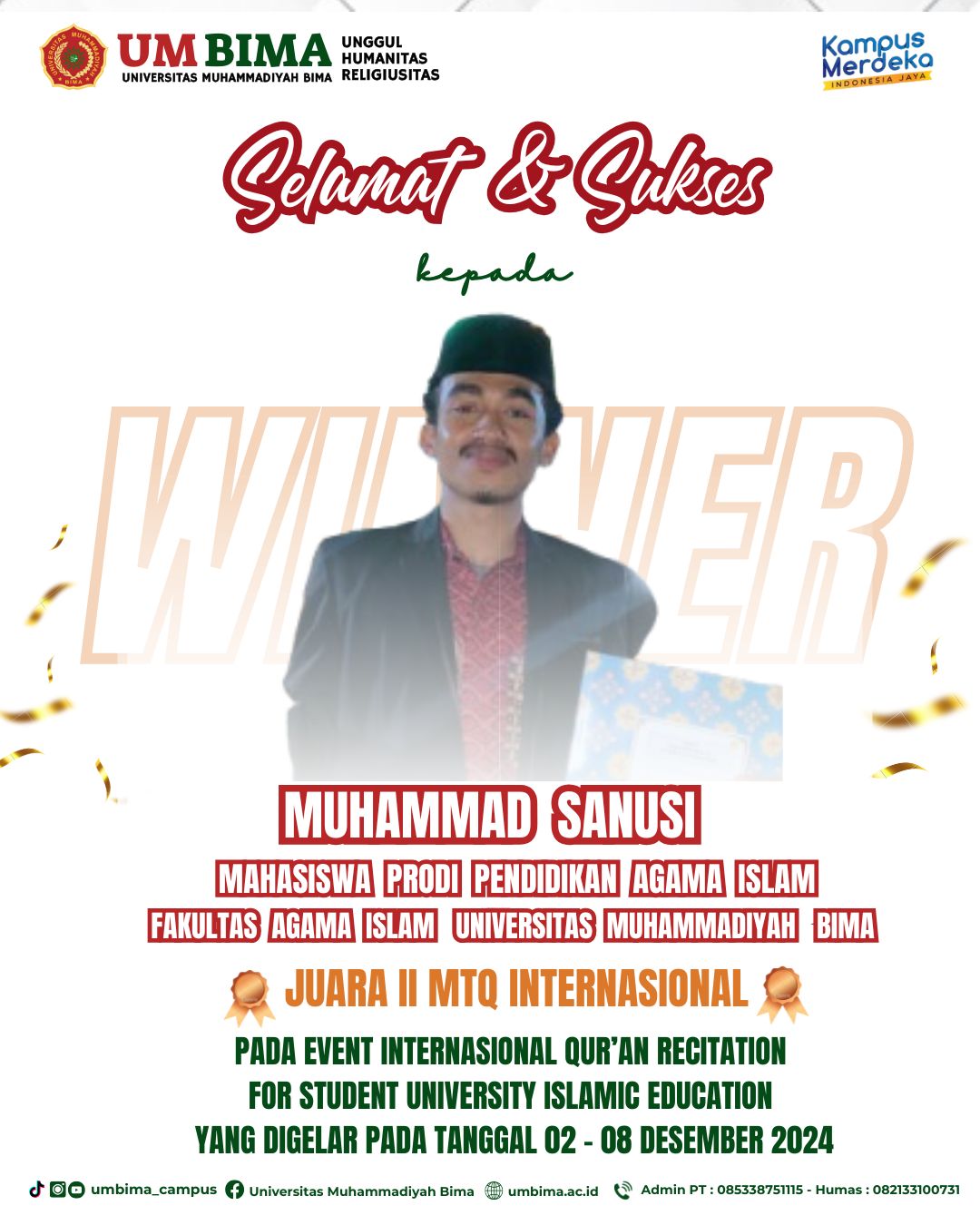 Muhammad Sanusi, mahasiswa Program Studi Agama Islam Fakultas Agama Islam Universitas Muhammadiyah Bima (UM Bima) meraih juara 1 pada ajang bergengsi MTQ internasional dengan tema “Quran Recitation for Student University Islamic Education,  yang digelar  pada Senin-Ahad (02-08/12/2024). Prestasi luar biasa ini tak hanya membawa kebanggaan bagi dirinya, tetapi juga bagi Universitas Muhammadiyah Bima.