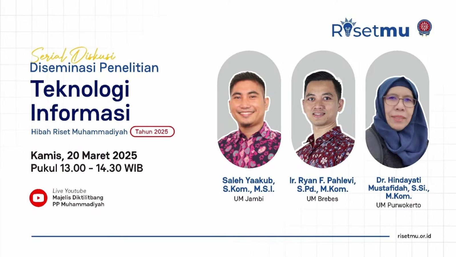 Dalam rangka mendorong inovasi berbasis teknologi, Majelis Diktilitbang PP Muhammadiyah kembali menggelar Serial Diskusi Hibah Riset Muhammadiyah 2025 bertajuk “Diseminasi Penelitian Teknologi Informasi”. Diskusi ini menghadirkan para akademisi dari berbagai Perguruan Tinggi Muhammadiyah dan ‘Aisyiyah (PTMA) yang telah melakukan penelitian di bidang teknologi informasi dan aplikasinya dalam berbagai sektor. Kegiatan ini diselenggarakan secara daring melalui Zoom Meeting dan disiarkan langsung melalui kanal YouTube Majelis Diktilitbang PP Muhammadiyah, pada Kamis (20/3).