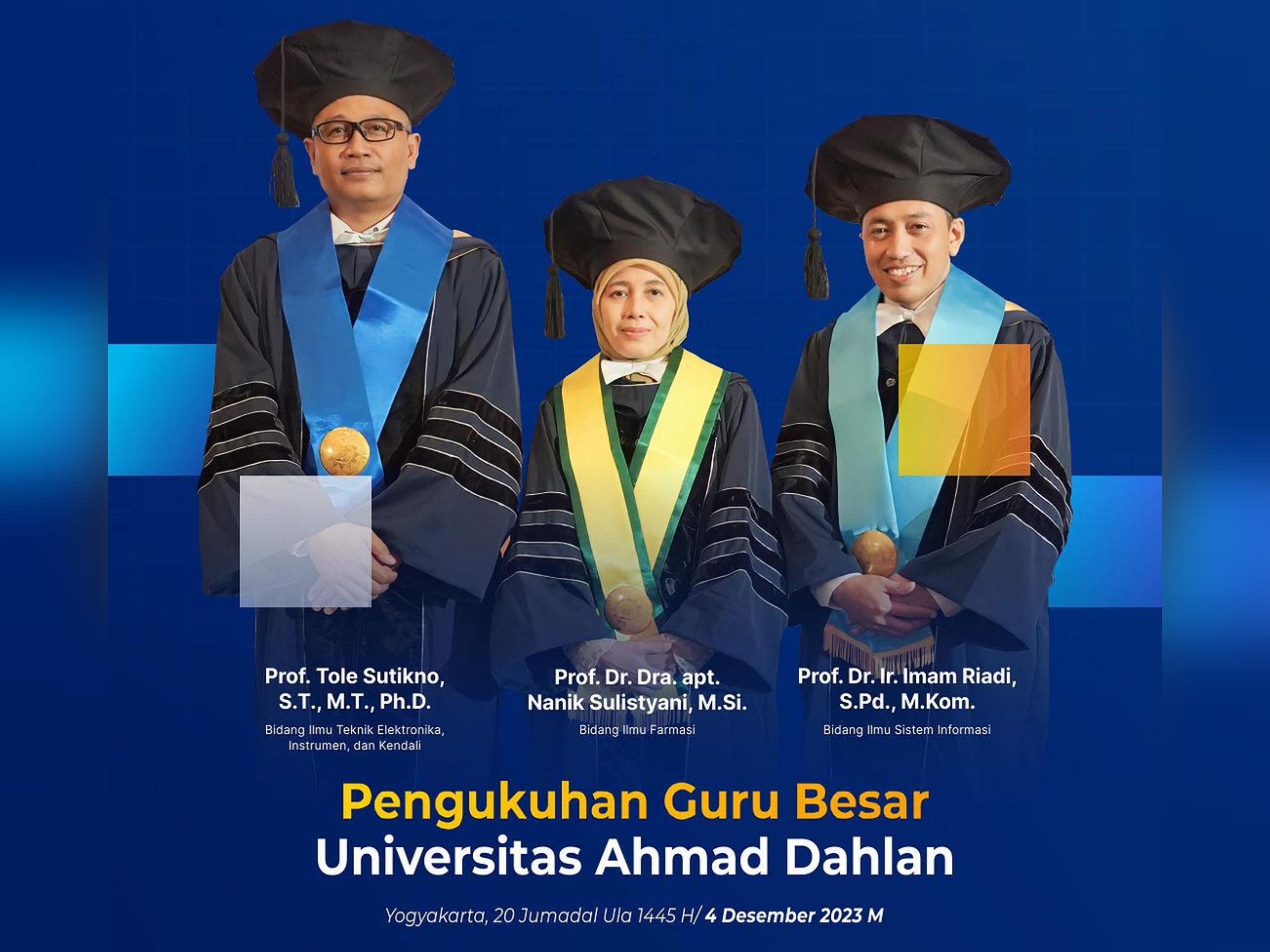 Sebanyak tiga dosen yang dikukuhkan menjadi Guru Besar, diantaranya Prof. Dr. Ir. Imam Riadi, S.Pd., M.Kom. (Bidang Ilmu Sistem Informasi), Prof. Dr. Dra. apt. Nanik Sulistyani, M.Si. (Bidang Ilmu Farmasi) dan Prof. Tole Sutikno, S.T., M.T., Ph.D. (Bidang Ilmu Teknik Elektronika, Instrumen, dan Kendali) dikukuhkan sebagai guru besar dalam agenda ini.