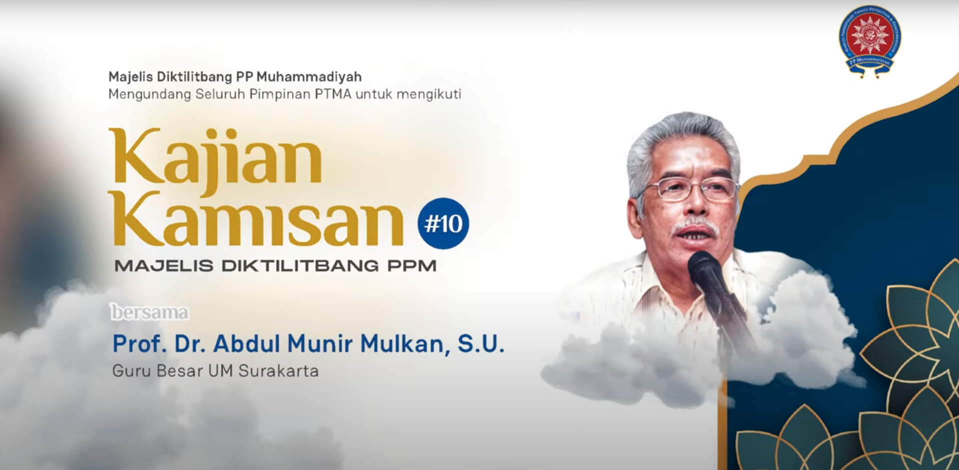 Majelis Pendidikan Tinggi Penelitian dan Pengembangan (Diktilitbang) PP Muhammadiyah kembali menggelar kegiatan rutin yakni Pengajian Kamisan. Dalam Pengajian Kamisan ke-10 kali ini mengusung tema “Tanggung Jawab Sosial PTMA Berbasis Islam Berkemajuan”. Pengajian berlangsung pada Kamis, (25/7/2024) secara daring lewat Zoom Meeting dan bisa disimak kembali di kanal YouTube Majelis Diktilitbang PP Muhammadiyah. Pengajian Kamisan diikuti oleh pimpinan Perguruan Tinggi Muhammadiyah dan ‘Aisyiyah (PTMA) se-Indonesia. Hadir selaku narasumber yakni Prof Dr Abdul Munir Mulkan, SU selaku Guru Besar Universitas Muhammadiyah Surakarta (UMS).