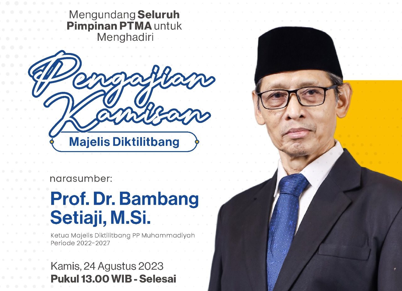 Majelis Diktilitbang PP Muhammadiyah mengadakan Pengajian Kamisan dengan tema “Pengajian Majelis Inward vs Outward Looking” secara daring, Kamis (24/08/2023). Program ini digagas bertujuan untuk mendukung tradisi literasi di Majelis dan PTMA. Program perdana ini diikuti hingga 150 peserta yang terdiri dari pimpinan harian, anggota pleno, dan pimpinan PTMA.