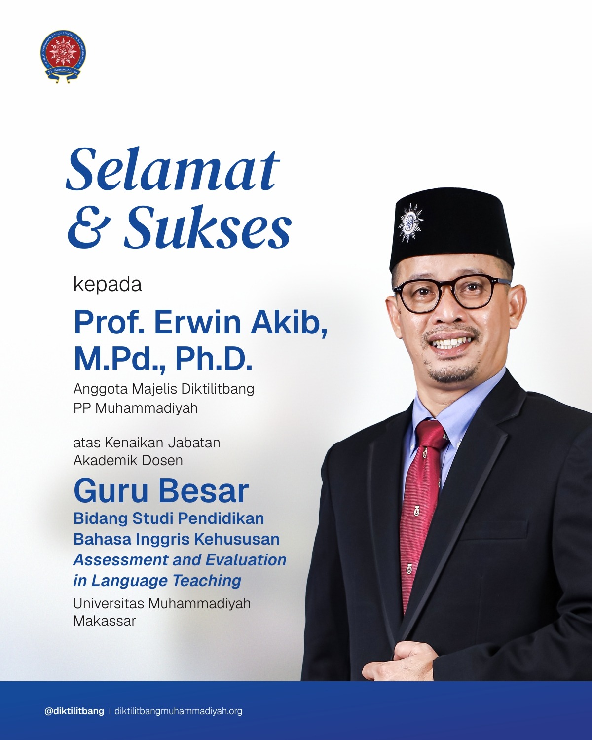 Universitas Muhammadiyah (Unismuh) Makassar kembali menorehkan prestasi membanggakan melalui pencapaian guru besar, yaitu Prof. Erwin Akib, S.Pd., M.Pd., Ph.D. sebagai Guru Besar dalam Bidang Studi Pendidikan Bahsa Inggris Kehususan Assessment and Evaluation in Language Teaching. Penyerahan Surat Keputusan Jabatan Akademik Guru Besar berlangsung pada Rabu, 30 Juli 2025, di Aula Ridwan Saleh Mattayang, Kantor LLDIKTI Wilayah IX, Makassar.