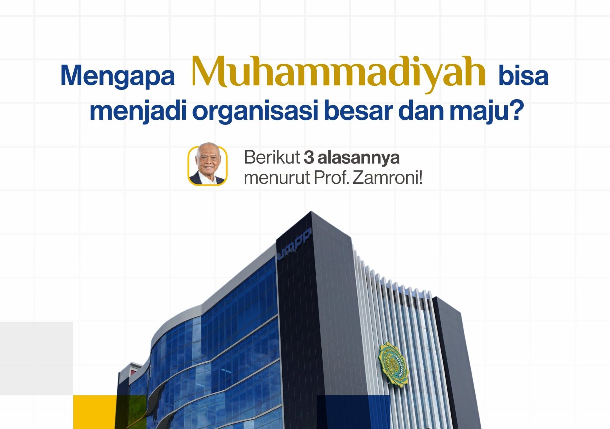 Muhammadiyah telah tumbuh menjadi sebuah organisasi yang sangat berpengaruh dalam berbagai bidang, termasuk pendidikan, kesehatan, sosial, dan dakwah. Berkaitan dengan hal tersebut, Prof. Zamroni, Bendahara Umum PP Muhammadiyah periode 2010-2015 memberikan pendapatnya pada pada Jumat (3/5) dalam acara halal bihalal yang diselenggarakan Kawan Sekerja Kantor Pimpinan Pusat Muhammadiyah. Pada kesempatan tersebut, Beliau memberikan tiga alasan mengapa Muhammadiyah saat ini bisa menjadi organisasi yang besar dan maju.