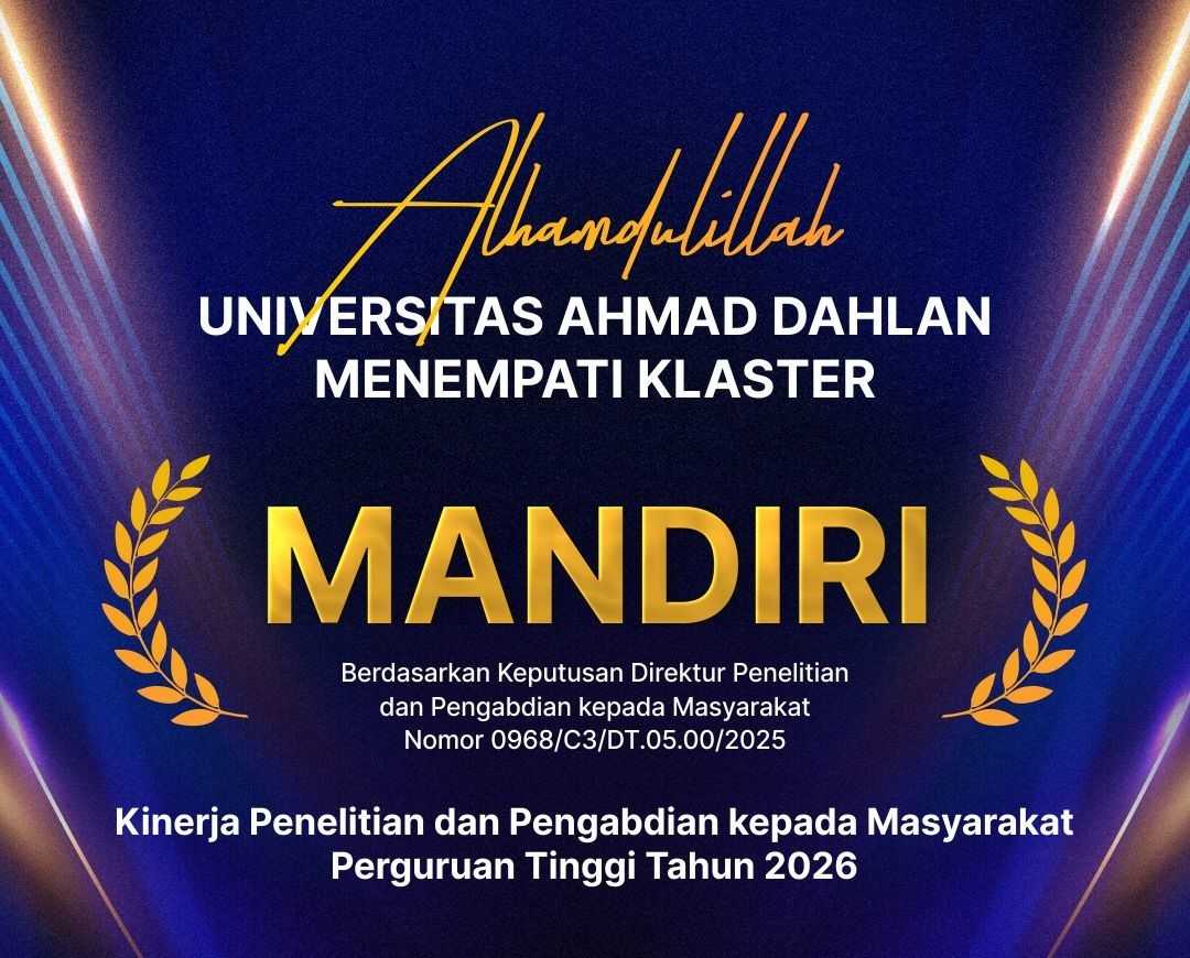 Universitas Ahmad Dahlan (UAD) kembali mencatatkan prestasi nasional setelah berhasil mempertahankan posisinya dalam Klaster Mandiri, klaster tertinggi penilaian kinerja penelitian dan pengabdian kepada masyarakat oleh Kementerian Pendidikan Tinggi, Sains, dan Teknologi (Kemendiktisaintek). Tahun ini, UAD menjadi satu dari 56 perguruan tinggi yang menempati klaster tertinggi dari total 1.159 perguruan tinggi akademik se-Indonesia.