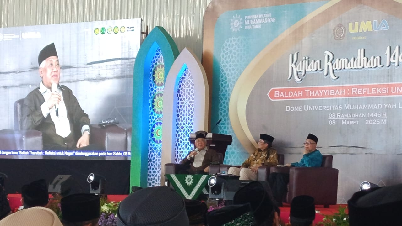 Prof. Dr. Din Syamsuddin, MA. Ph.D, menghadiri Kajian Ramadan Pimpinan Wilayah Muhammadiyah (PWM) Jawa Timur yang berlokasi di Dome Universitas Muhammadiyah Lamongan (UMLA), Sabtu (8/3/2025).