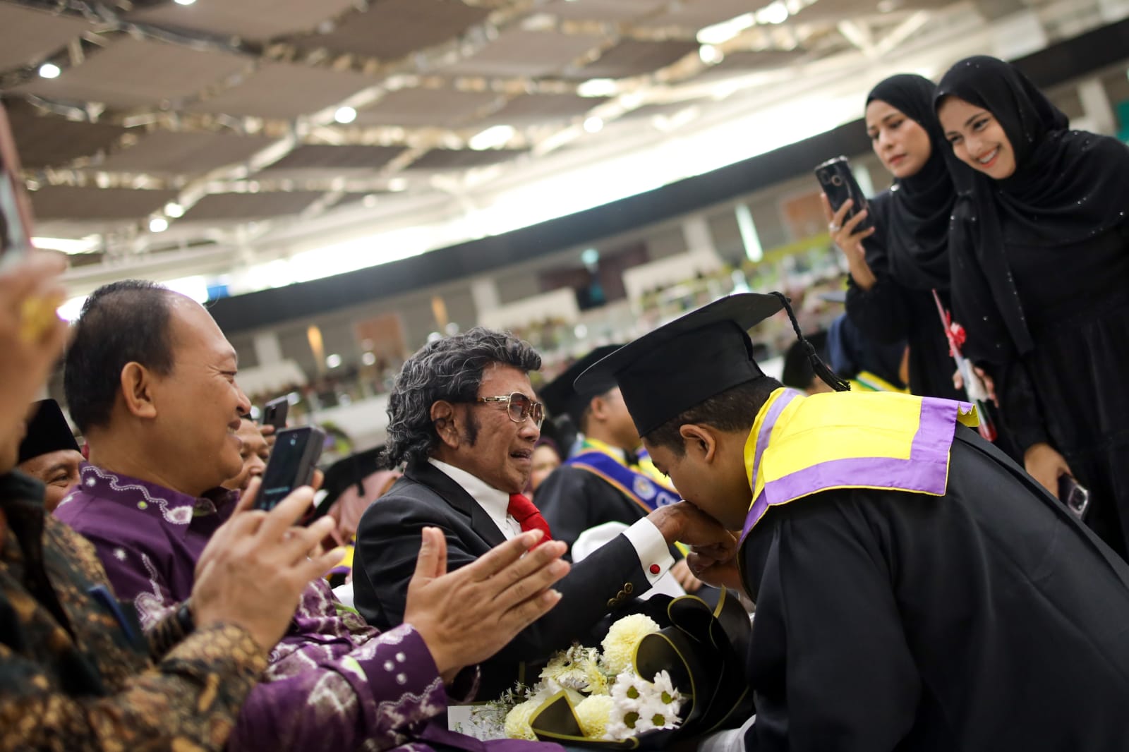 Bersama keluarga, Rhoma Irama menghadiri Upacara Wisuda Sarjana, Magister, dan Doktor Periode I Tahun 2024/2025 Universitas Muhammadiyah Surakarta (UMS) dengan rasa senang dan bahagia atas gelar baru yang di raih oleh putranya.