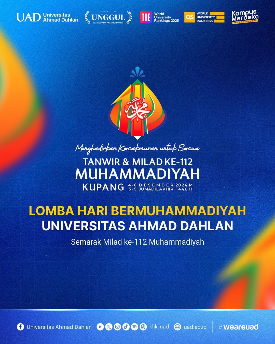 Milad Muhammadiyah yang ke-112 dan Milad UAD yang ke-64 menjadi momentum penting untuk meneguhkan semangat kebersamaan, mempererat hubungan antara seluruh elemen civitas akademika. Dalam acara ini, tercipta suasana yang penuh keceriaan dan kekompakan. Baik dari penampilan peserta lomba hingga semangat kolaborasi dalam setiap kegiatan. Rektor juga berharap, kegiatan ini tidak hanya menjadi ajang kompetisi. Namun juga menjadi refleksi dari semangat dakwah dan pendidikan yang terus berkembang di Universitas Ahmad Dahlan. []ic