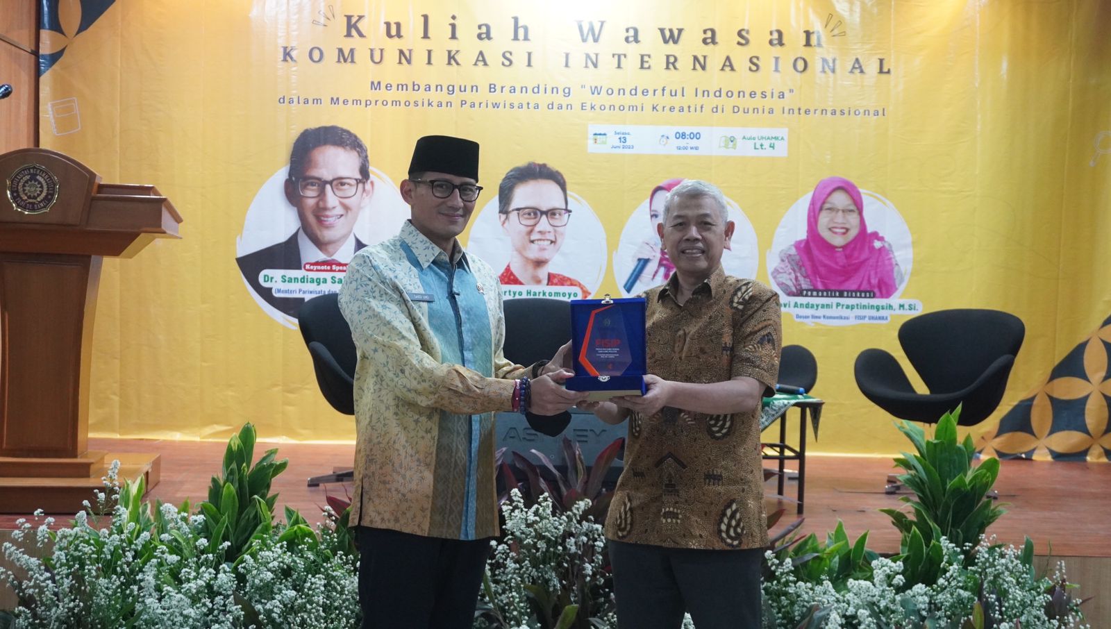 Program Studi Ilmu Komunikasi Fakultas Ilmu Sosial dan Ilmu Politik (FISIP) Universitas Muhammadiyah Prof dr Hamka (Uhamka) menyelenggarakan Kuliah Wawasan Komunikasi Internasional dengan tema Membangun Branding Wonderful Indonesia dalam Mempromosikan Pariwisata dan Ekonomi Kreatif di Dunia Internasional. Acara ini dilakukan secara langsung di Aula lantai 4 Uhamka Limau serta secara daring melalui aplikasi zoom dan akun Youtube Official FISIP Uhamka, Selasa (13/6).