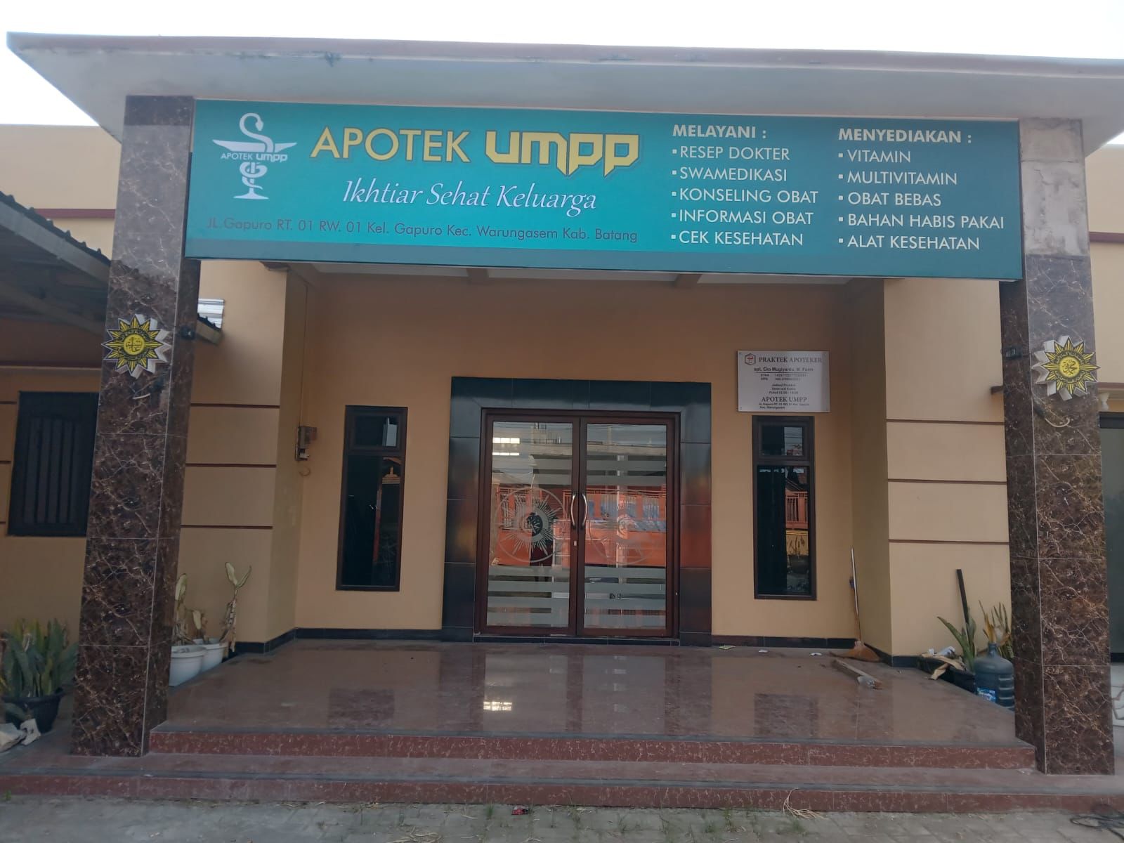 Apotek UMPP beralamat di Jl. Gapuro RT.01, RW.01 Kelurahan Gapuro Kecamatan Warungasem Kabupaten Batang Provinsi Jawa Tengah. Apotek UMPP merupakan salah satu cikal bakal badan usaha yang dimiliki oleh UMPP di bidang kesehatan. Bidang ekonomi, UMPP telah memiliki al-birru minimarket yang berlokasi di Fakultas Ilmu Kesehatan Kampus 2 Ambokembang. Apotek UMPP memiliki tagline Ikhtiar Sehat Keluarga yang artinya apotek UMPP merupakan tempat pelayanan sebagai jembatan untuk menyehatkan seluruh keluarga. Pendirian Apotek UMPP ini merupakan suatu komitmen UMPP untuk dapat memberikan pelayanan kepada masyarakat luas.
