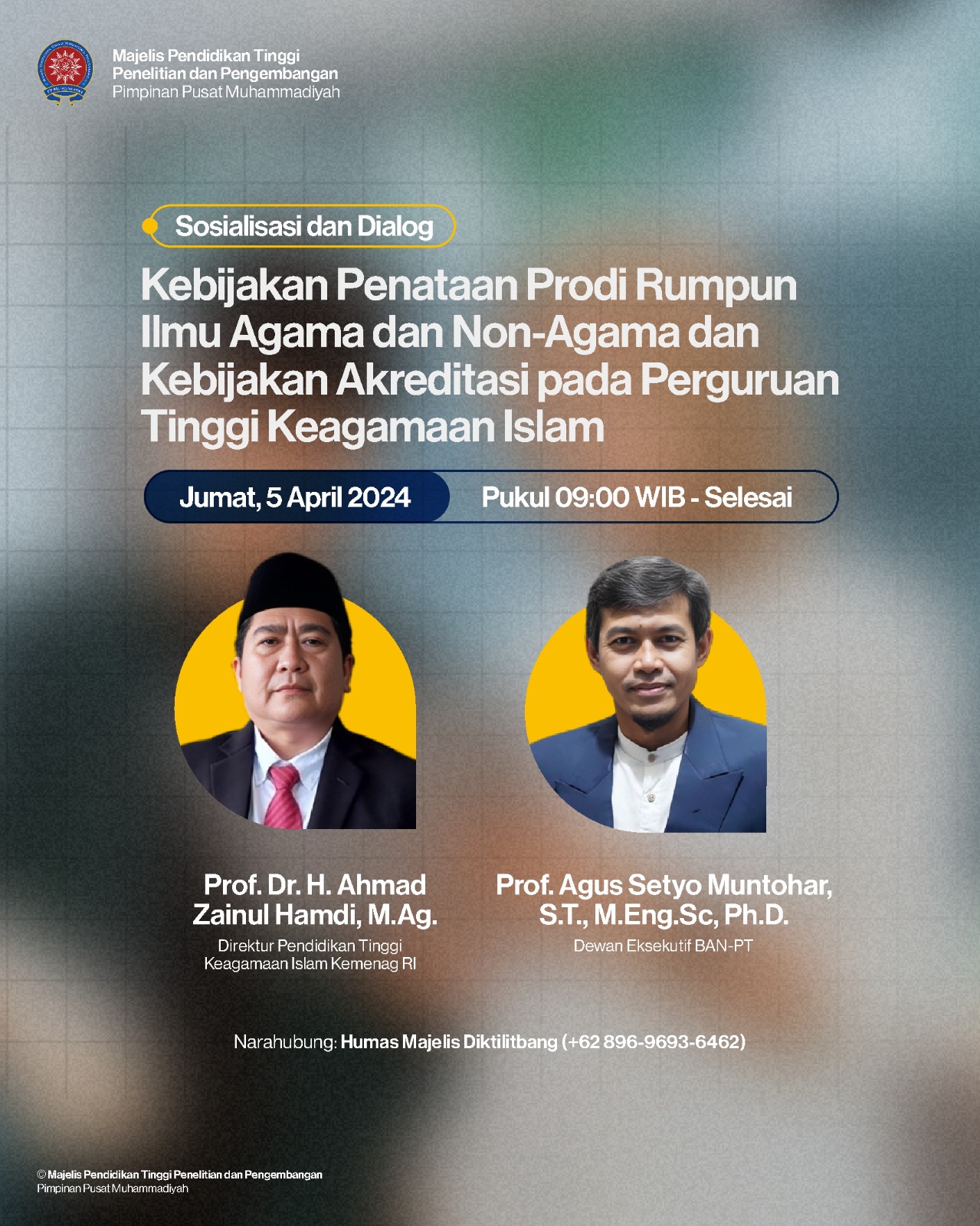 Guna meningkatkan mutu pendidikan tinggi Muhammadiyah sekaligus menerapkan kebijakan Kementerian Agama Indonesia tentang pembenahan kampus Perguruan Tinggi Keagamaan Islam (PTKI). Majelis Pendidikan Tinggi Penelitian dan Pengembangan (Diktilitbang) PP Muhammadiyah menyelenggarakan agenda bertajuk “Sosialisasi dan Dialog Kebijakan Penataan Prodi Rumpun Ilmu Agama dan Non-Agama dan Kebijakan Akreditasi pada Perguruan Tinggi Keagamaan Islam”.