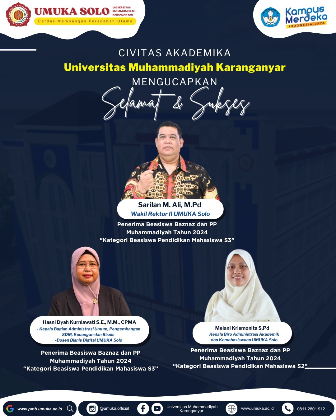 Dalam kategori Beasiswa Pendidikan Mahasiswa S-3 diperoleh oleh Sarilan M Ali, yang saat ini menjabat sebagai Wakil Rektor II Universitas Muhammadiyah Karanganyar, dan Hasni Dyah Kurniawati, yang saat ini menjabat sebagai Kepala Bagian Administrasi Umum, Pengembangan SDM, Keuangan dan Bisnis sekaligus sebagai Dosen Bisnis Digital di UMUKA. Prestasi ini menunjukkan dukungan Baznas dan PP Muhammadiyah terhadap kontribusi mereka dalam pengembangan ilmu pengetahuan dan riset di tingkat doktoral.