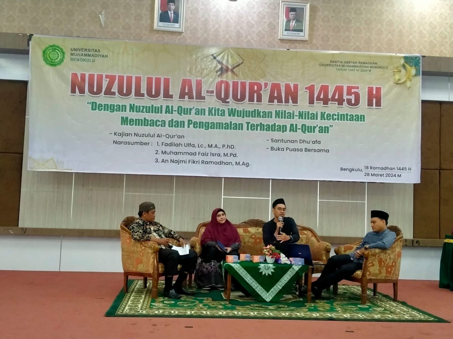 Universitas Muhammadiyah (UM) Bengkulu gelar talkshow dan kajian ilmiah dalam rangka memperingati nuzululquran 1445 H. Agenda yang berlangsung di Aula Hassan Dien pada Kamis, (28/3/2024) mengusung tema “Dengan Nuzululquran Kita Wujudkan Nilai-nilai Kecintaan Membaca dan Pengamalan terhadap Al-Qur’an” serta diikuti oleh Pimpinan Muhammadiyah dan ‘Aisyiyah Bengkulu, sivitas akademika serta masyarakat di lingkungan Kampus 4 UM Bengkulu.