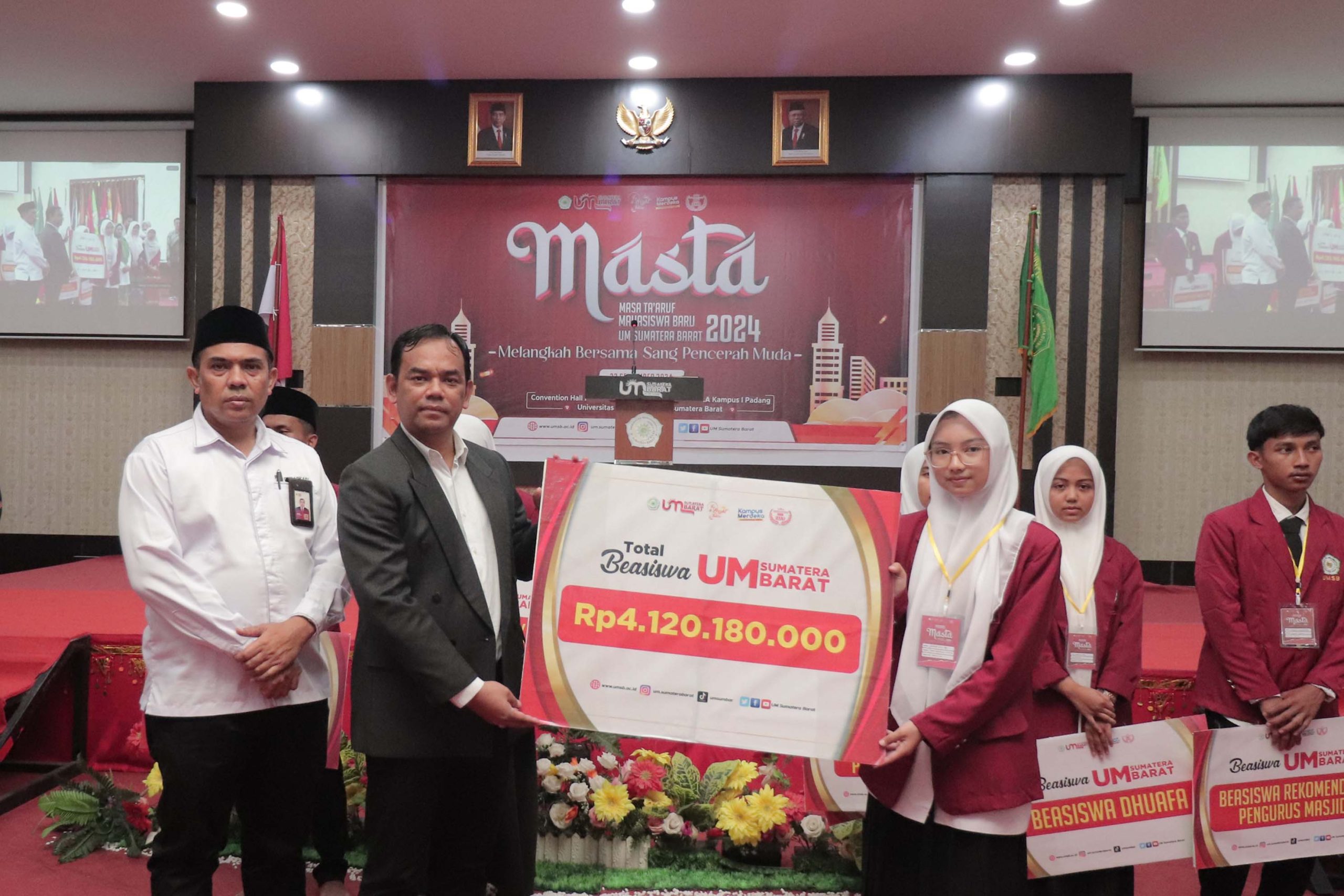 Universitas Muhammadiyah (UM) Sumatera Barat memberikan beasiswa senilai Rp. 4.120.180.000 bagi mahasiswa baru angkatan 2024. Beasiswa tersebut diserahkan secara simbolis pada kegiatan Masa Taaruf (Masta) Mahasiswa Baru angkatan 2024 yang diselenggarakan di Convention Hall Prof. Dr. Ahmad Syafi’I Ma’arif, M.A, di Kampus I Padang, Senin (23/9).
