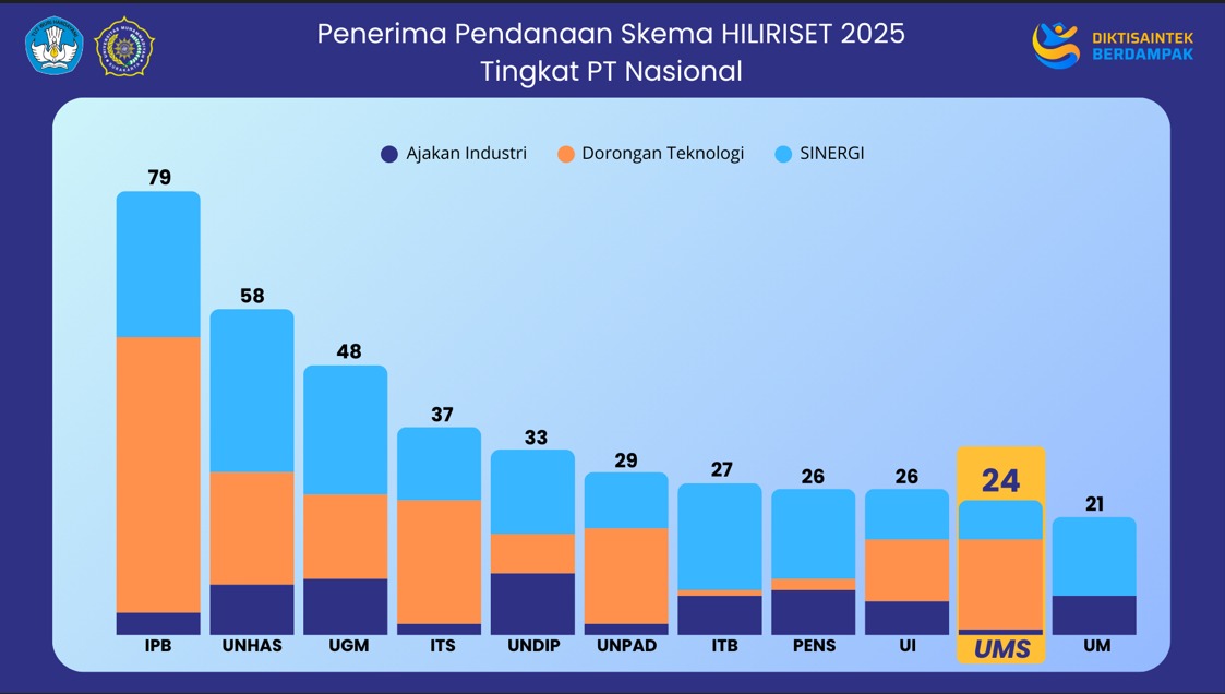 Kasubdit Riset dan Sentra KI Direktorat Riset, Pengabdian kepada Masyarakat, Publikasi, dan Sentra KI (DRPPS) UMS Prof. Dr. Ambarwati, M.Si., menyebut bahwa keberhasilan ini datang dari partisipasi aktif UMS di tiga skema program Hiliriset Kemendiktisaintek yaitu Dorongan Teknologi (Dortek), Ajakan Industri (Ajakin), dan Sinergi.