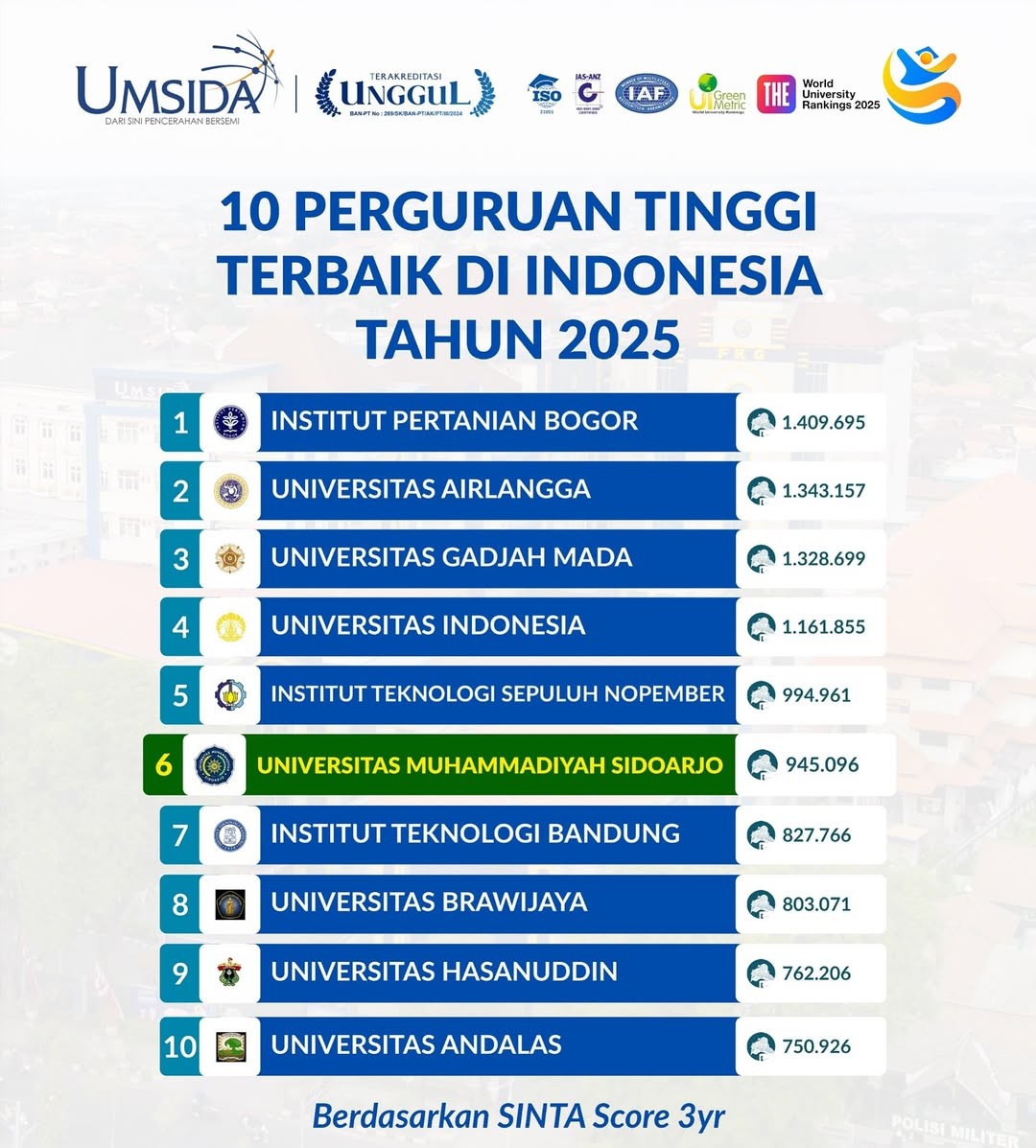 Dalam daftar tersebut, Umsida menempati peringkat ke-6 nasional dengan total skor 945.096, berada di atas sejumlah kampus ternama seperti Institut Teknologi Bandung (ITB), Universitas Brawijaya (UB), Universitas Hasanuddin (Unhas), dan Universitas Andalas (Unand).
