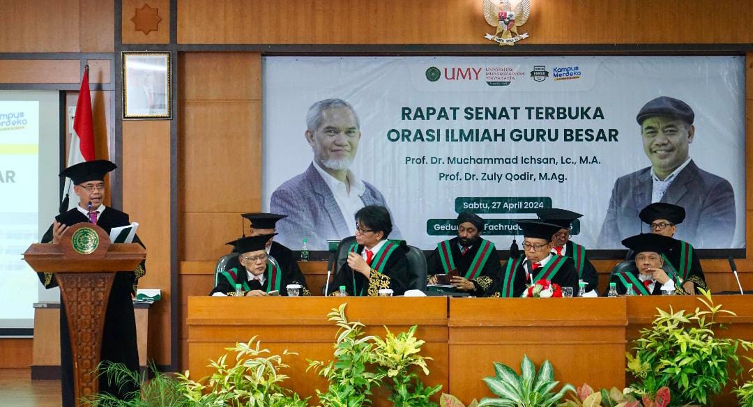 Universitas Muhammadiyah Yogyakarta (UMY) kembali mengukuhkan dua Guru Besar baru, Sabtu (27-4-2024). Proses pengukuhan dilaksanakan di Gedung AR Fachruddin B Lantai 5 UMY. Kedua Guru Besar yang dikukuhkan tersebut ialah Prof Dr Muchammad Ichsan, Lc MA sebagai Guru Besar Ilmu Hukum Islam dan Prof Dr Zuly Qodir, MAg dikukuhkan sebagai Guru Besar Bidang Ilmu Sosiologi.