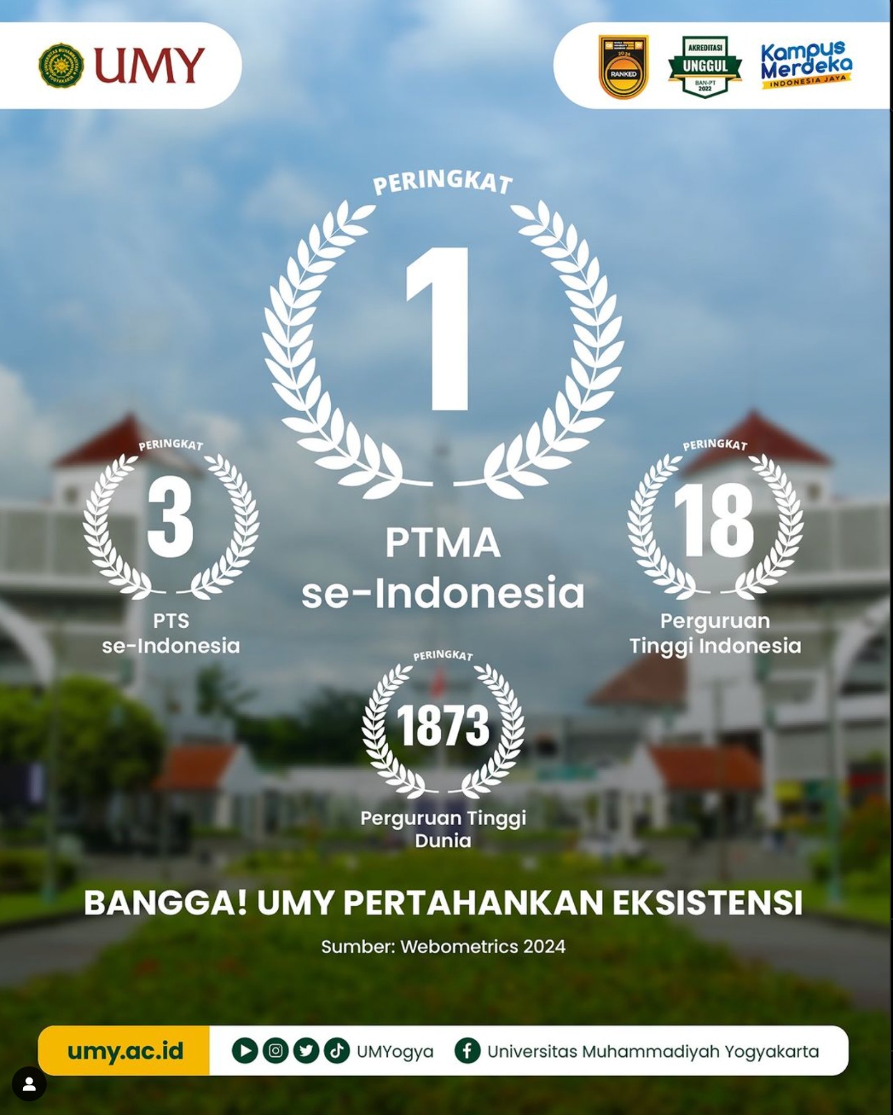 Lembaga Pemeringkatan Webometrics baru-baru ini merilis daftar peringkat universitas di seluruh dunia termasuk Indonesia, dalam edisi pertama bulan Januari 2024. Menurut hasil pemeringkatan tersebut, Universitas Muhammadiyah Yogyakarta (UMY) kembali menegaskan posisinya sebagai 3 besar Perguruan Tinggi Swasta (PTS) terbaik di Indonesia. UMY juga sebagai Perguruan Tinggi Muhammadiyah ‘Aisyiyah (PTMA) terbaik di Indonesia, serta menjadi PTS terbaik di Daerah Istimewa Yogyakarta (DIY) dan Jawa Tengah.
