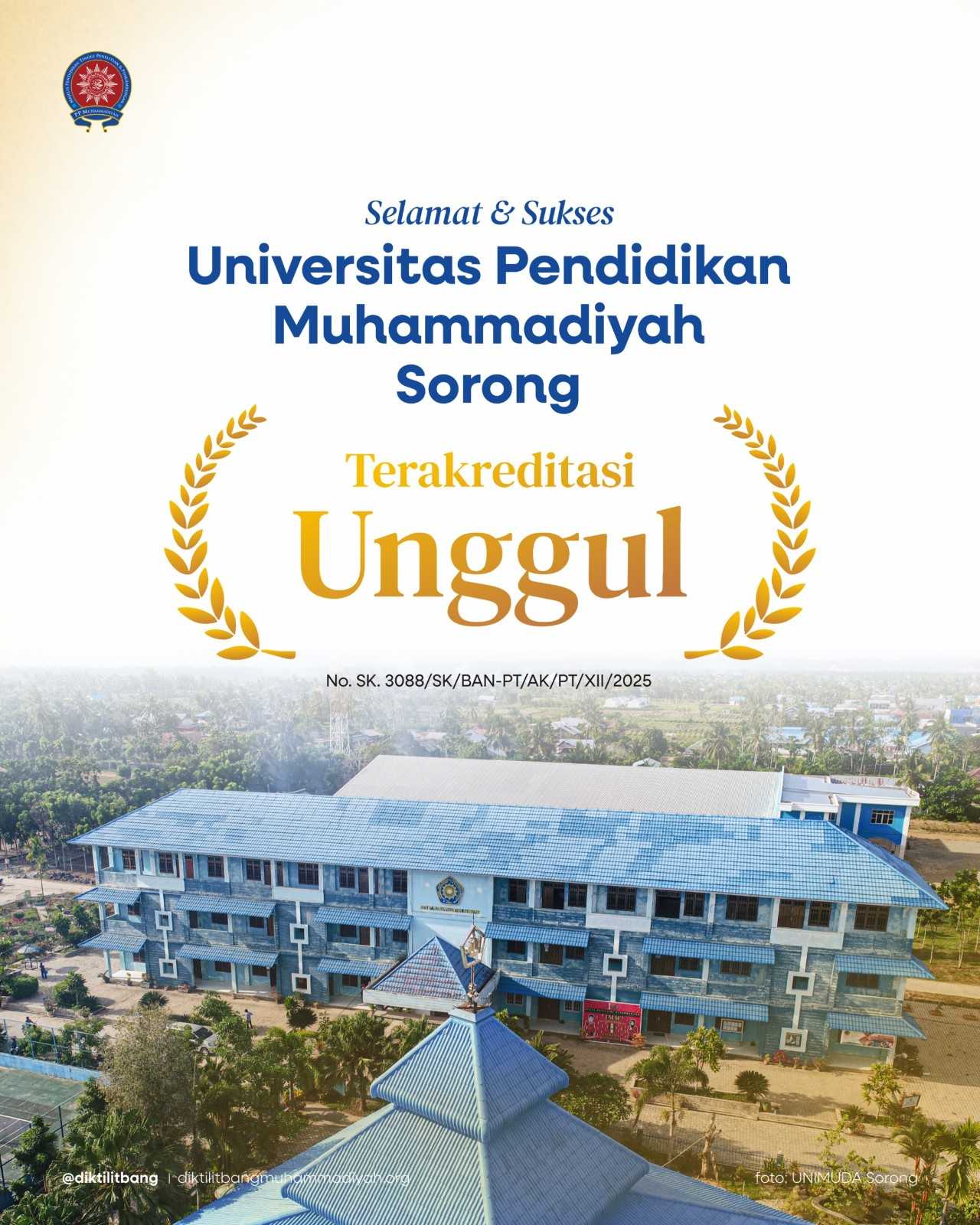 Universitas Pendidikan Muhammadiyah (UNIMUDA) Sorong resmi mencatatkan sejarah baru pendidikan tinggi di kawasan timur Indonesia. Berdasarkan Surat Keputusan BAN-PT Nomor 3088/SK/BAN-PT/AK/PT/XII/2025, UNIMUDA Sorong dinyatakan Terakreditasi Unggul, menjadikannya perguruan tinggi pertama di Tanah Papua dan Tanah Maluku yang meraih predikat tertinggi akreditasi institusi.