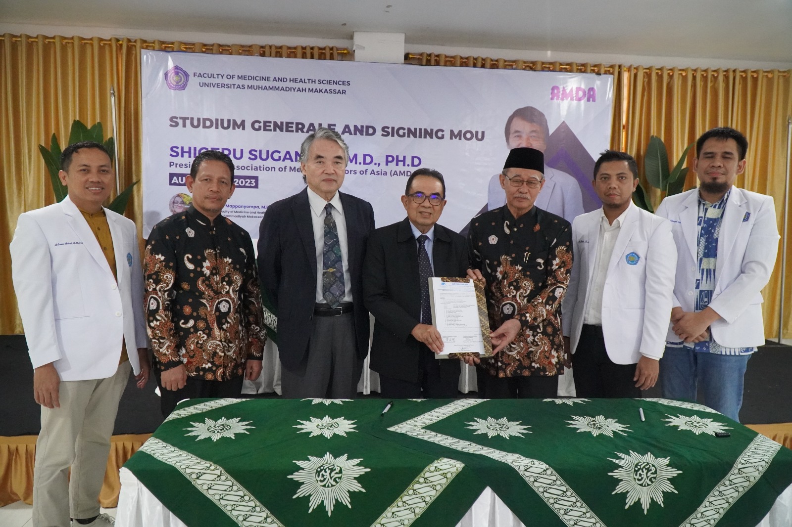 Fakultas Kedokteran dan Ilmu Kesehatan (FKIK) Universitas Muhammadiyah (Unismuh) Makassar menggelar Studium Generale dan penandatanganan nota kesepahaman (MOU) dengan Shigeru Suganami, M.D., Ph.D., Presiden Association of Medical Doctors of Asia (AMDA). Kegiatan dihelat di Aula Fakultas Kedokteran Unismuh, Kamis, (05/08/2023). Rektor Unismuh Prof. Ambo Asse dan Shigeru Suganami menandatangani MOU tersebut, yang menjadi penanda kolaborasi antara lembaga pendidikan dan AMDA dalam bidang penelitian dan pengembangan di sektor kesehatan.