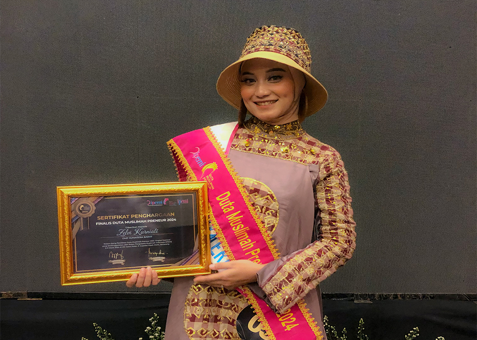 Zelvi Kurniati, mahasiswa Program Studi Pendidikan Bahasa dan Sastra Indonesia (PBSI), Universitas Muhammadiyah (UM) Sumatera Barat berhasil meraih penghargaan prestisius sebagai juara Duta Muslimah Preneur Budaya 2024 dalam kompetisi tingkat nasional yang diadakan oleh Institut Pendidikan Entrepreneur Muslim Indonesia (IPEMI) Pusat.